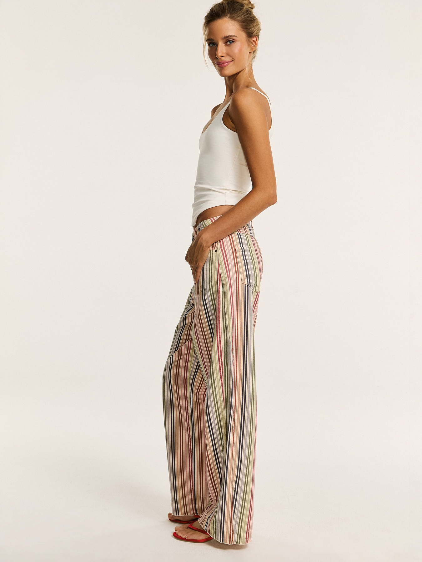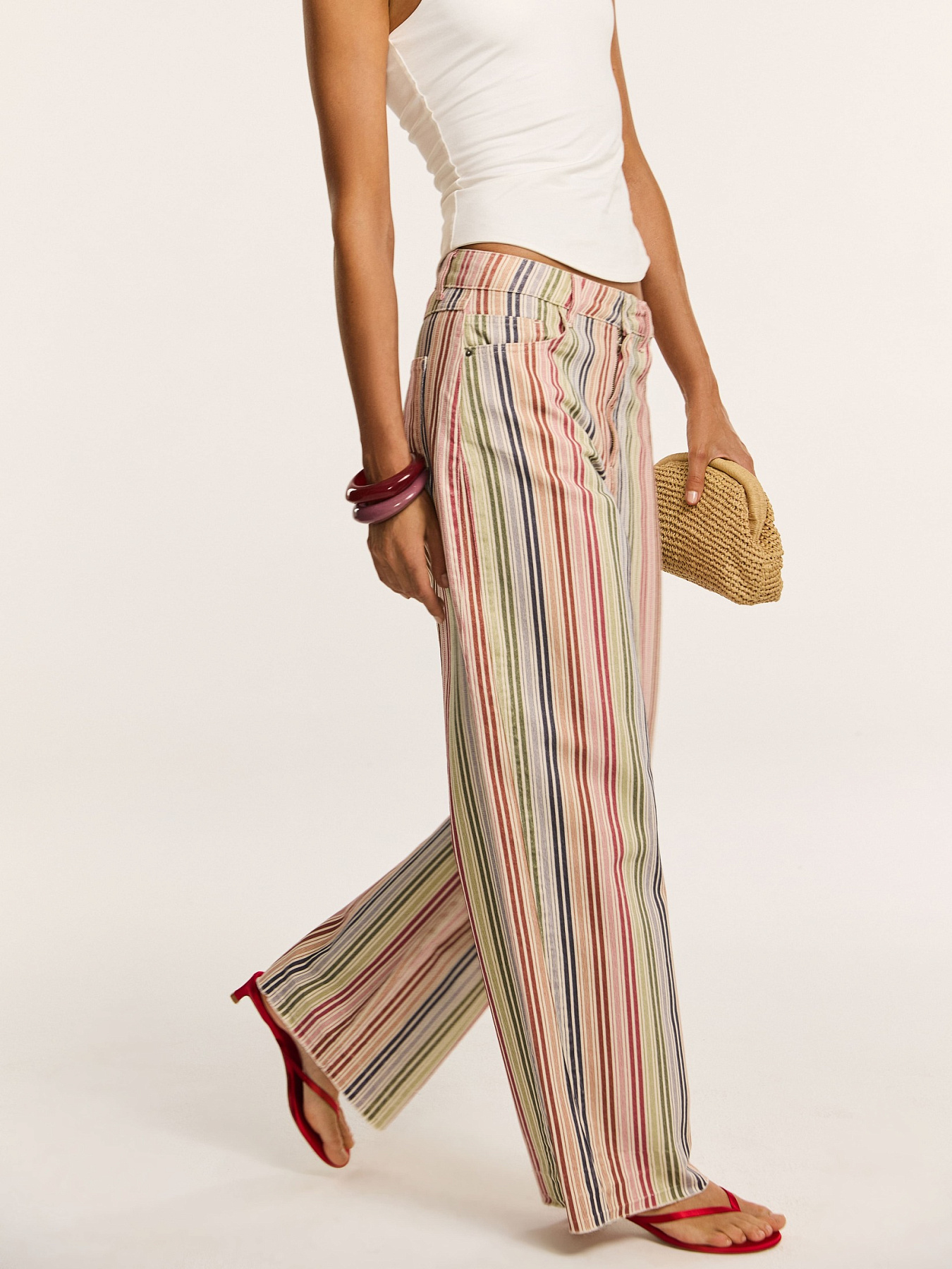 Джинсы прямого объёмного кроя в многоцветную полоску — модель, которая отсылает к главной идее коллекции: полоса как символ Капри.