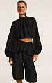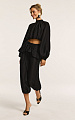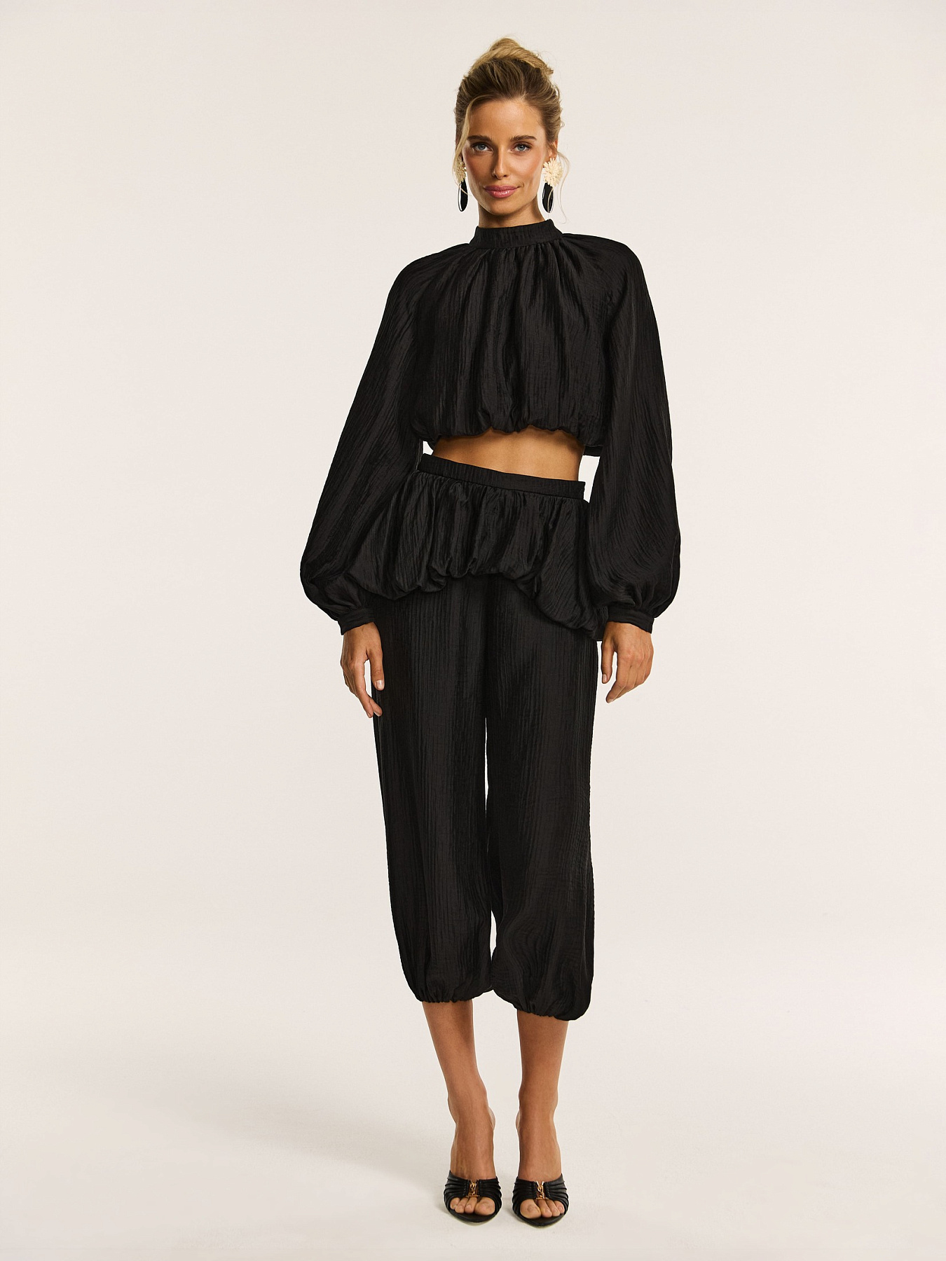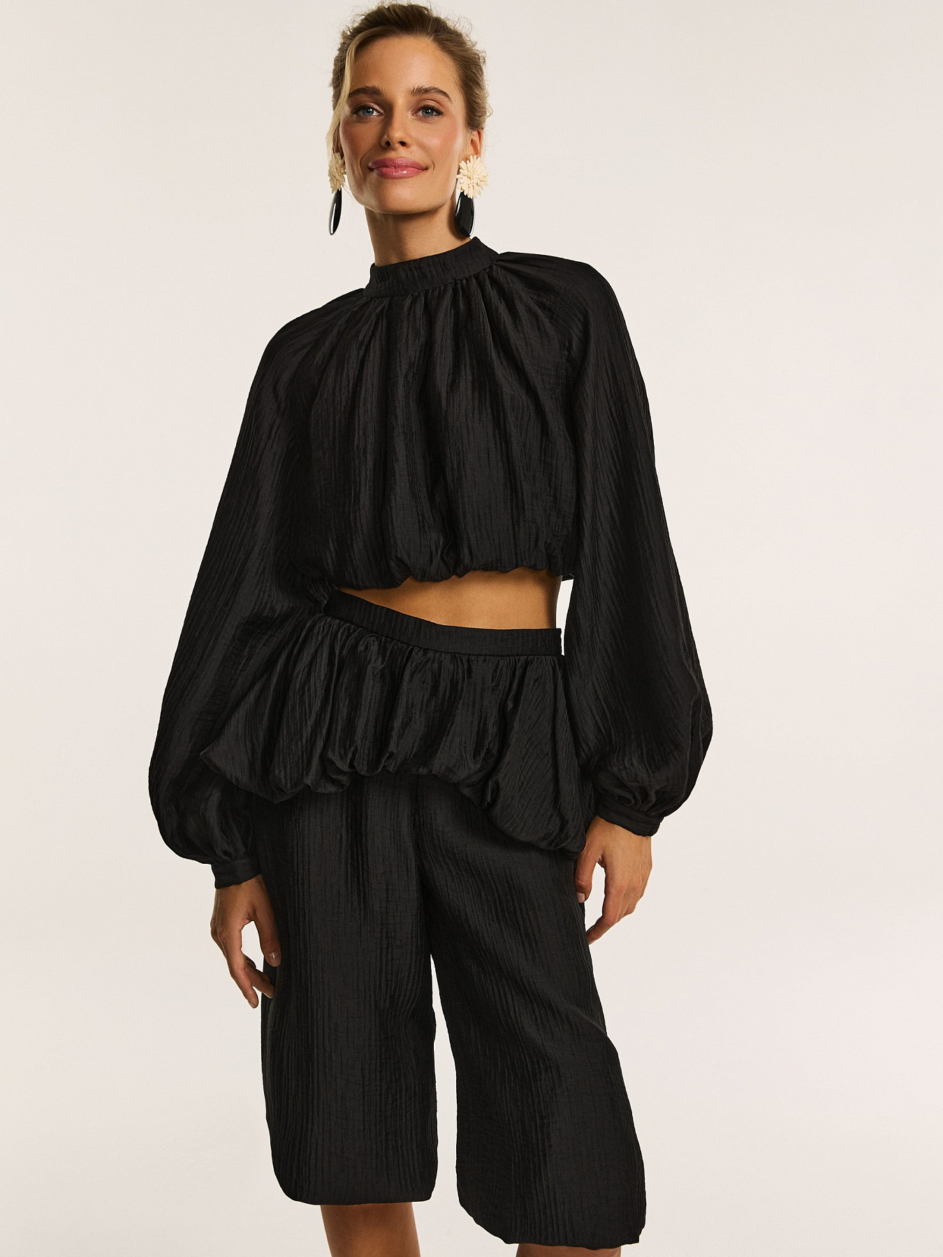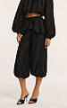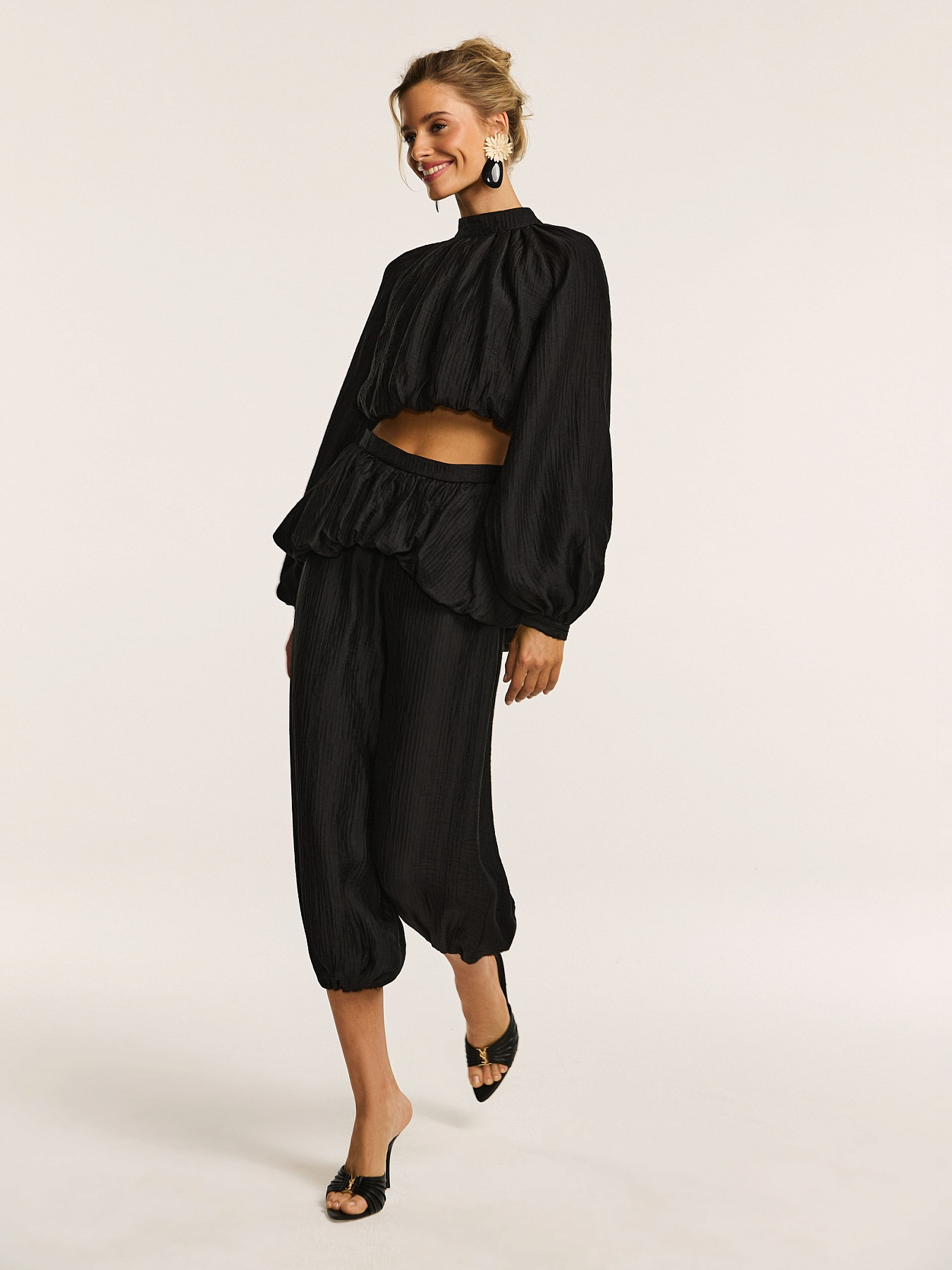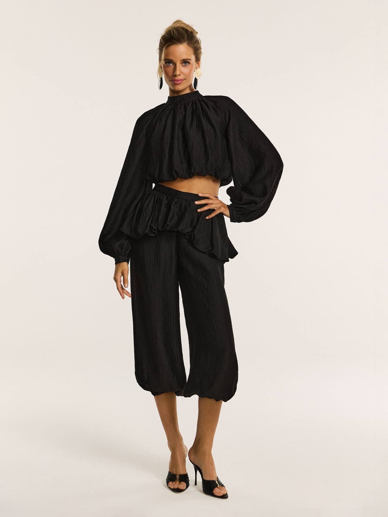 Укороченные шаровары из фактурной итальянской вискозы с тенселем в глубоком черном оттенке — выразительная модель с акцентом на объем и сложную фактуру.