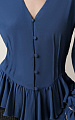 Полуприлегающий силуэт формируется за счет вытачек, застроченных на лицевую сторону, а отрезная линия талии, расположенная под углом, визуально удлиняет силуэт. От этой линии начинается широкий волан, повторяющий диагональ кроя. На рукавах — аккуратные горизонтальные складки, создающие игру фактур. Застёжка выполнена на обтяжные пуговицы и навесные петли.