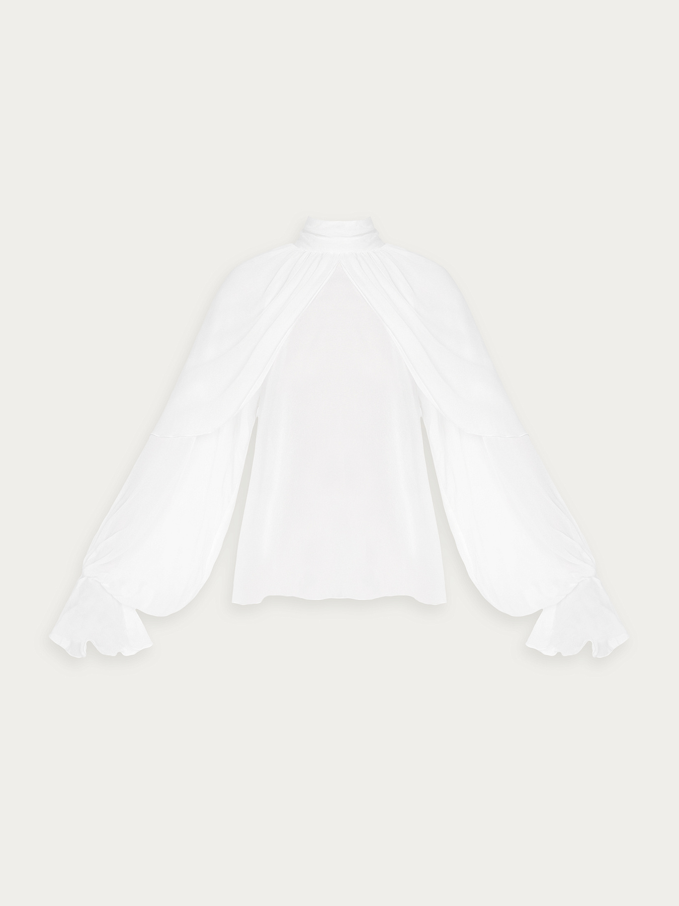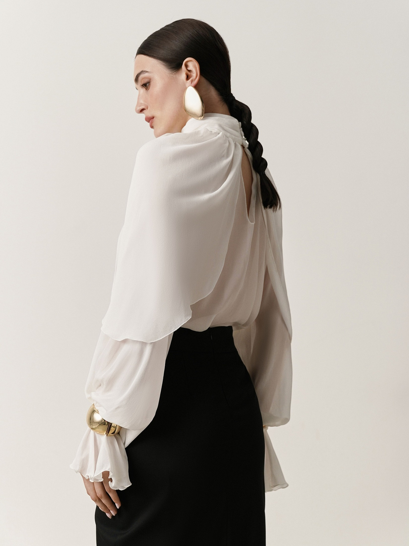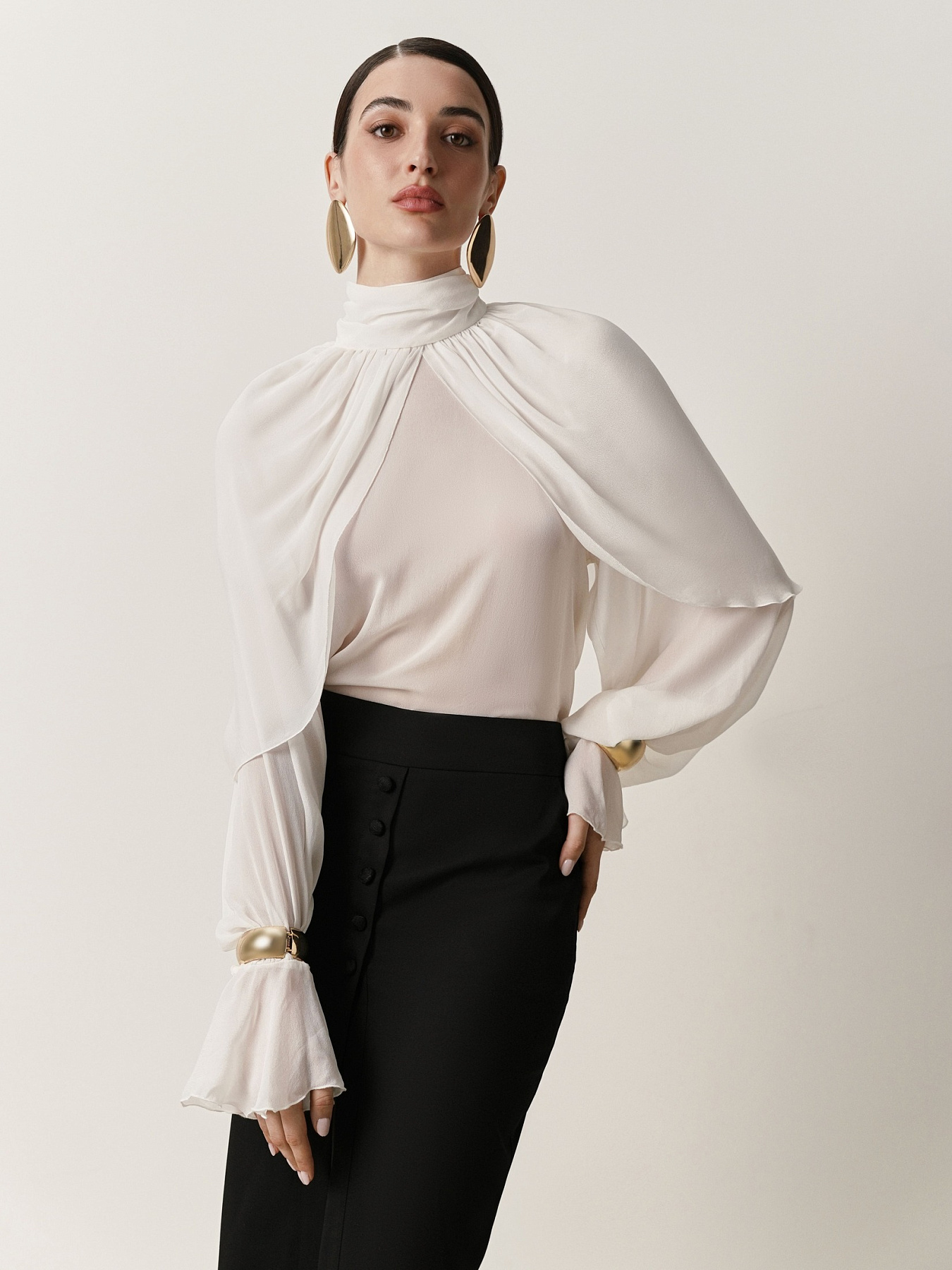 Блуза объемного кроя из итальянского шифона. Свободный силуэт формируется сборкой по линии горловины и расширяющимся кроем от груди, придающим легкость и плавное движение ткани.