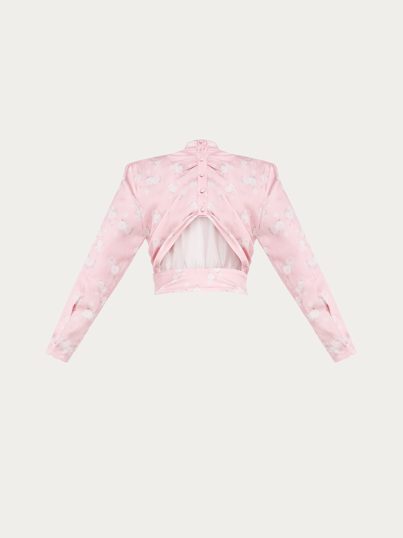 На розовом фоне — молочные ранункулюсы, хаотично рассыпанные по полотну. Принт создан специально для этой коллекции нашим графическим дизайнером.