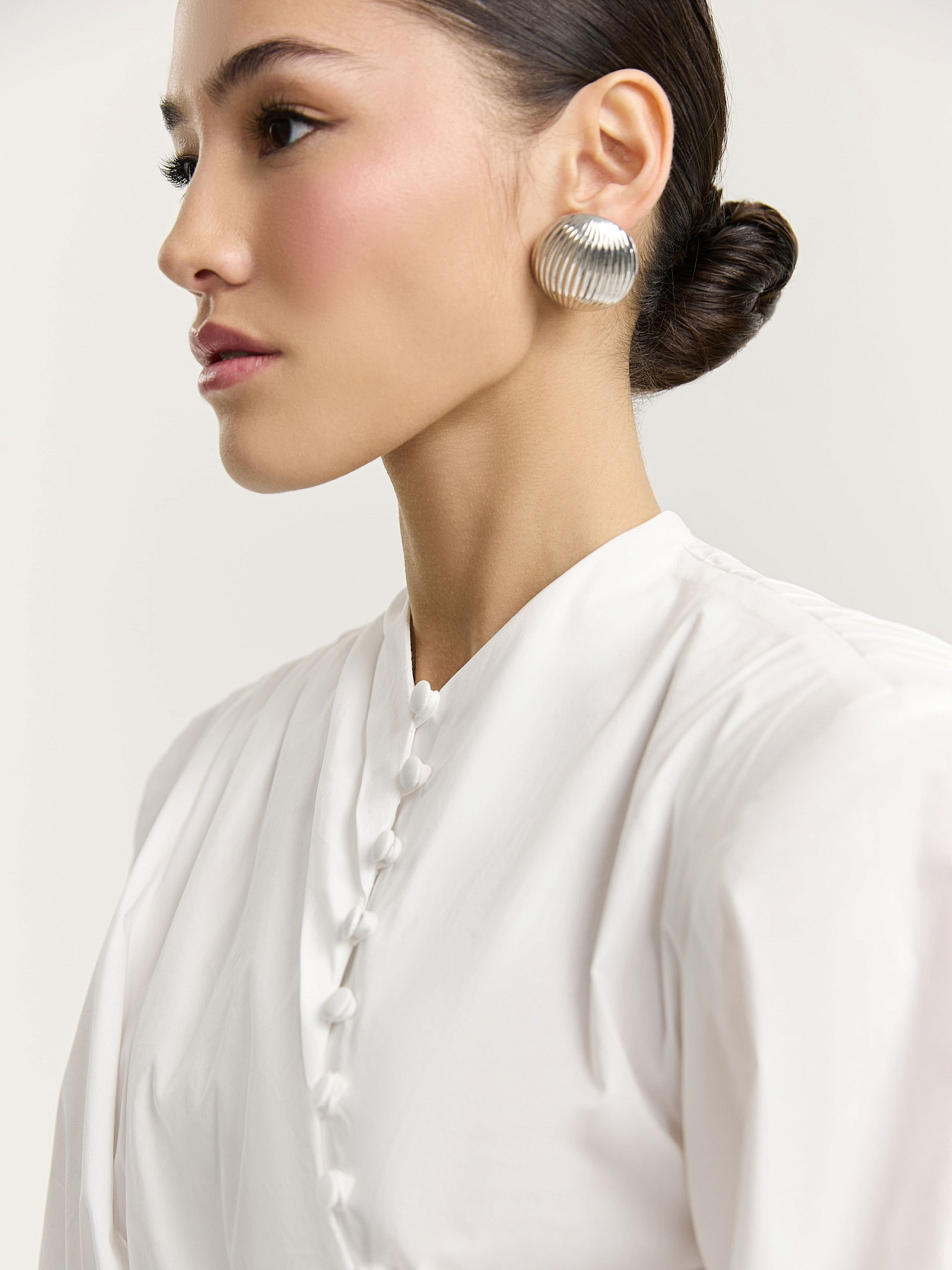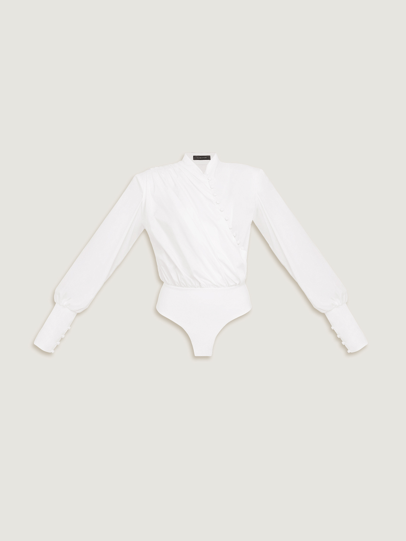 Рубашка-боди из итальянского хлопка и вискозного джерси. Верхняя часть выполнена из рубашечного хлопка и построена на запахе: асимметричная застежка на обтяжные пуговицы и навесные петли подчеркивает архитектуру формы.