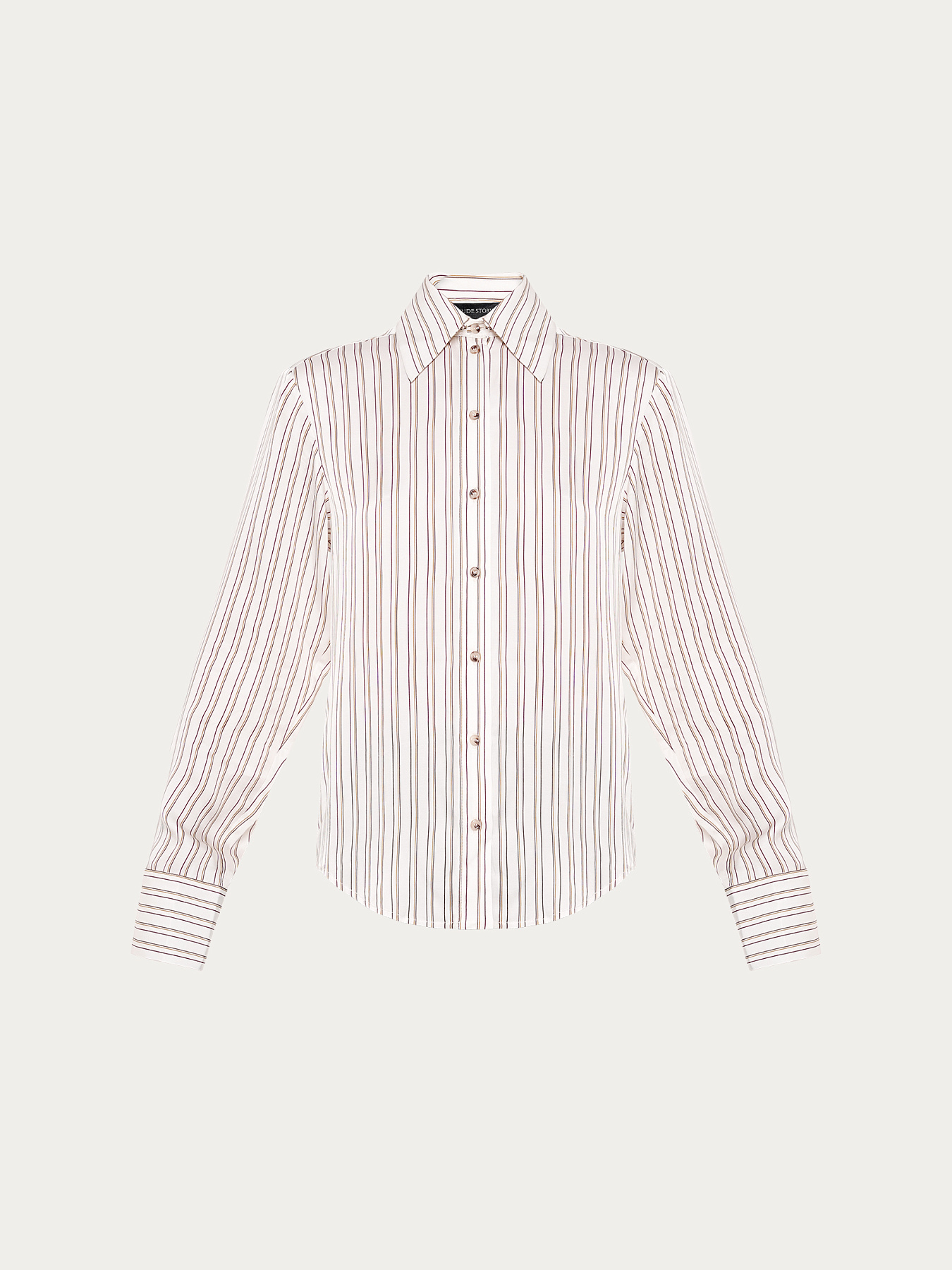 Форма рубашки формируется за счет вертикальных талиевых вытачек на спине и спереди, которые подчеркивают линию силуэта. Классический отложной воротник и центральная застежка на пуговицы с прорезными петлями подчеркивают чистоту кроя.