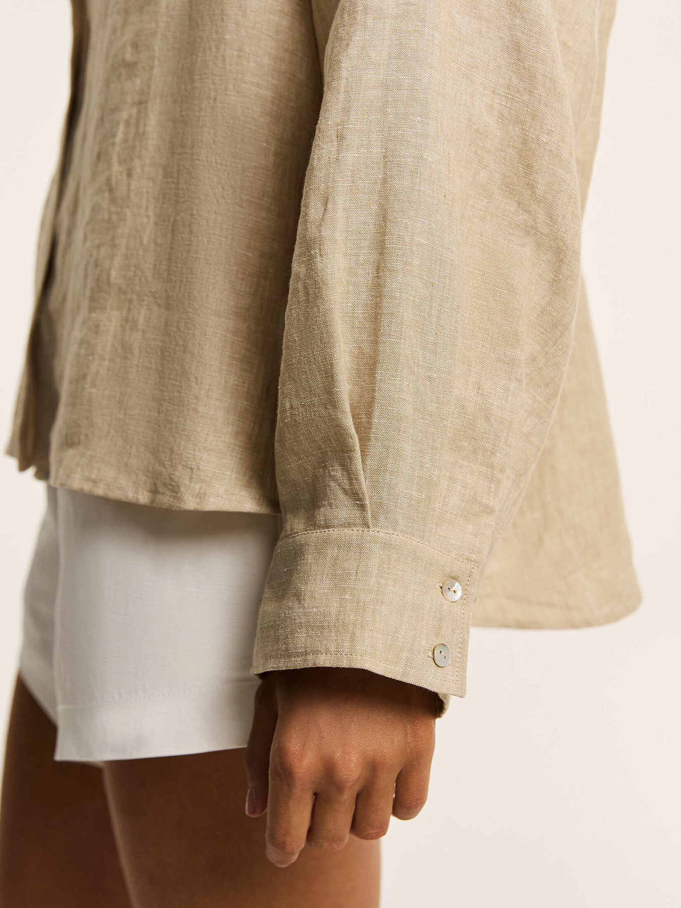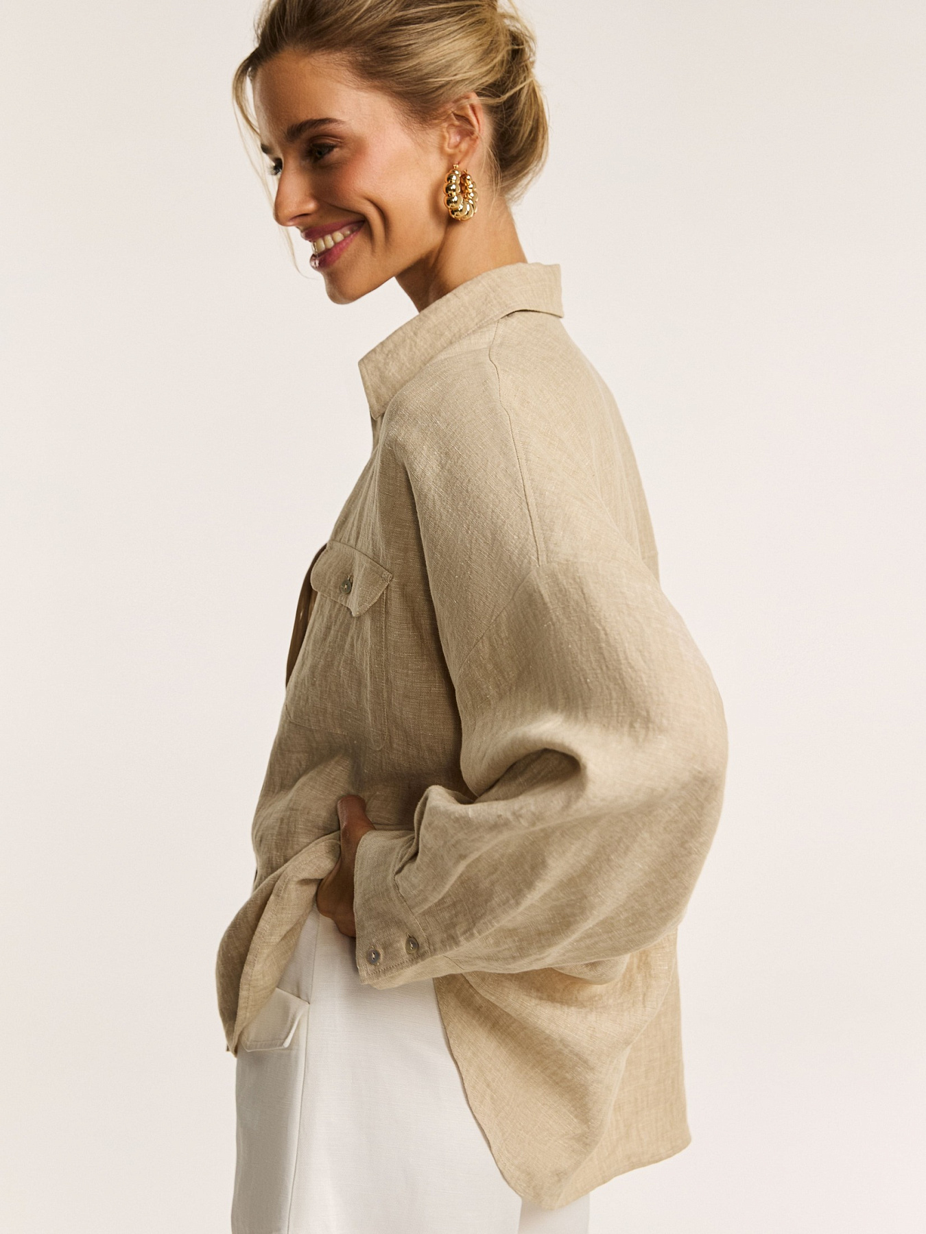 Объемная рубашка свободного силуэта из итальянского льна в благородном бежевом оттенке — модель, в которой естественная фактура материала и расслабленная элегантность существуют в идеальном равновесии.