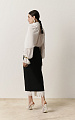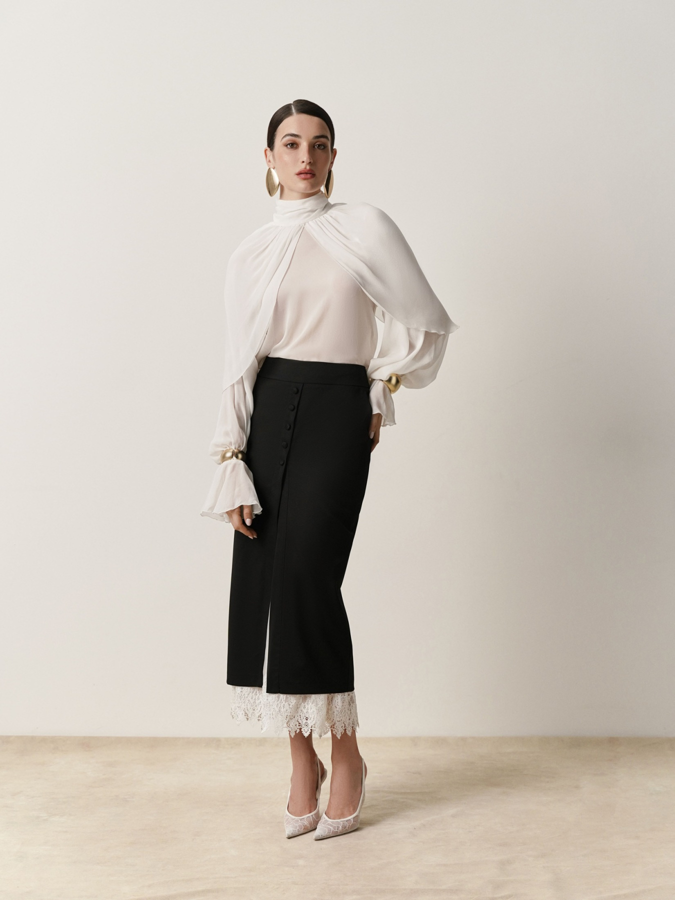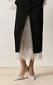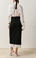 Двойная юбка, объединяющая строгий силуэт и игру фактур. Верхняя часть выполнена из итальянской костюмной шерсти в черном цвете — юбка прямого кроя длины миди с имитацией центральной застежки.
