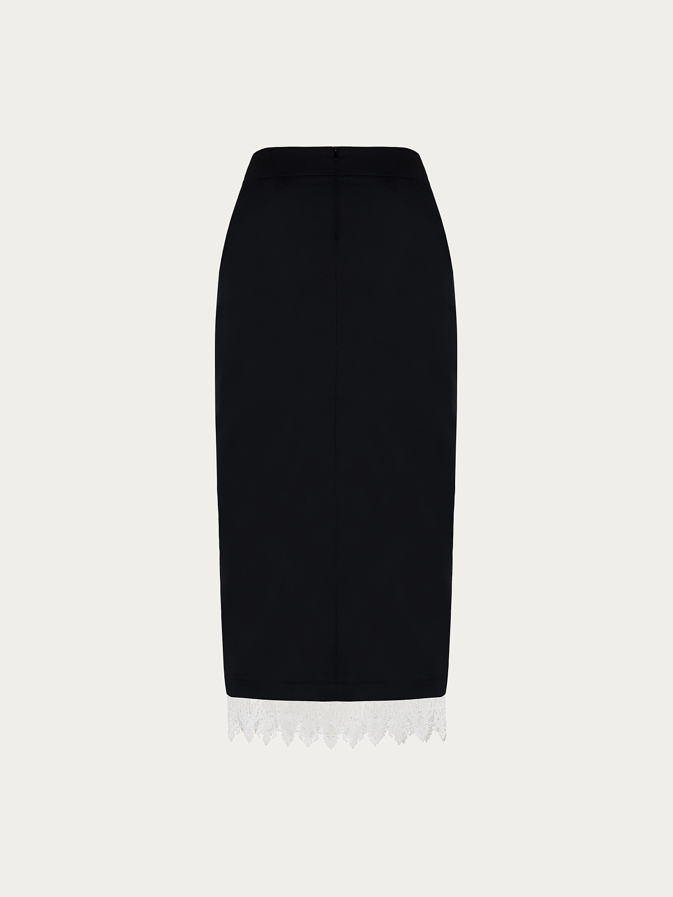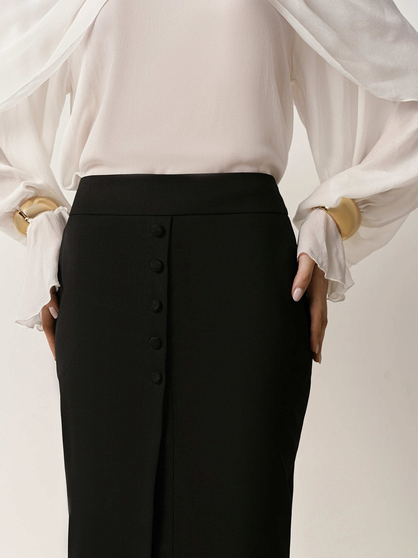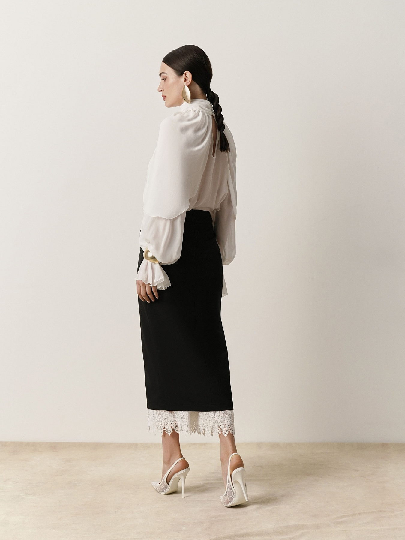 Двойная юбка, объединяющая строгий силуэт и игру фактур. Верхняя часть выполнена из итальянской костюмной шерсти в черном цвете — юбка прямого кроя длины миди с имитацией центральной застежки.