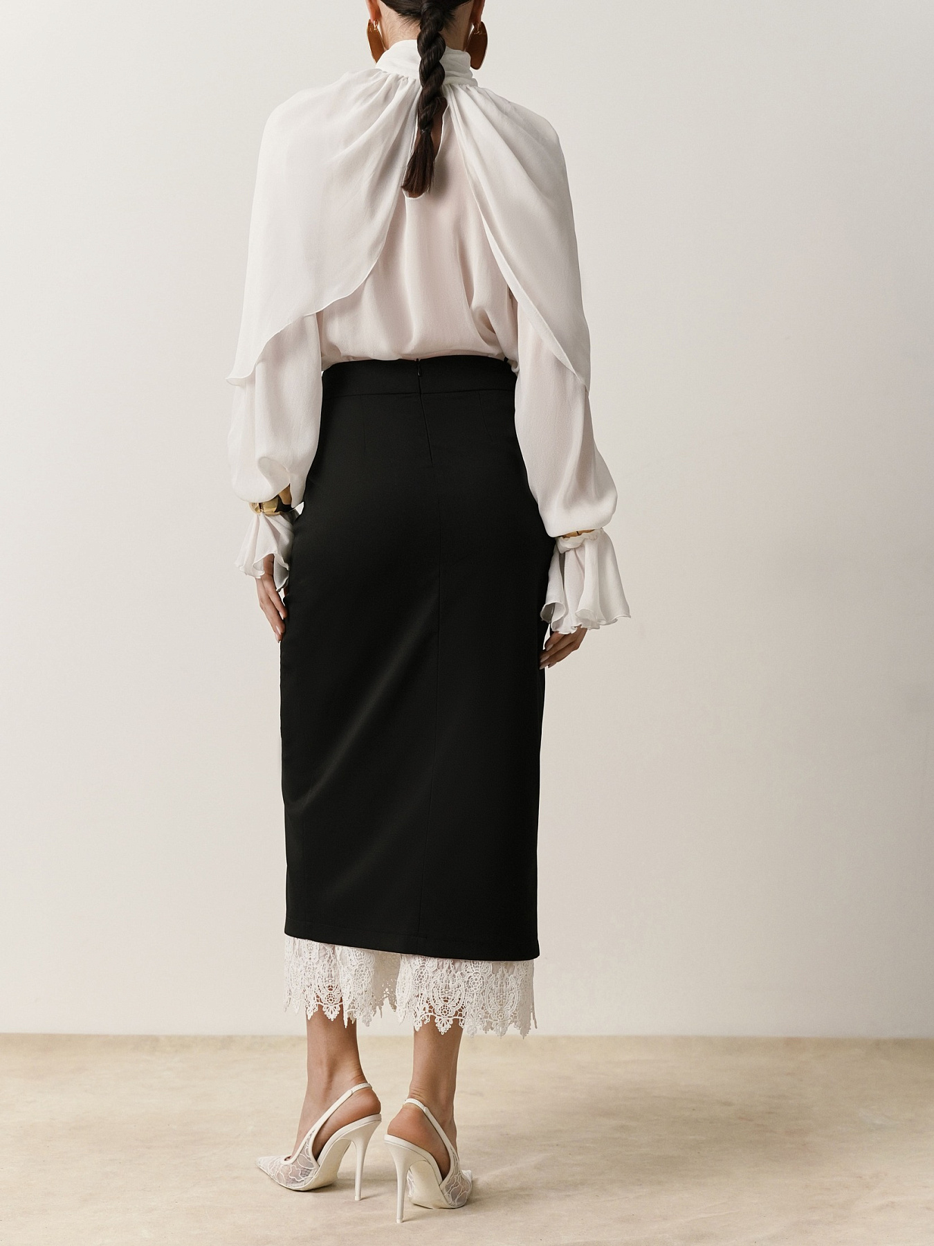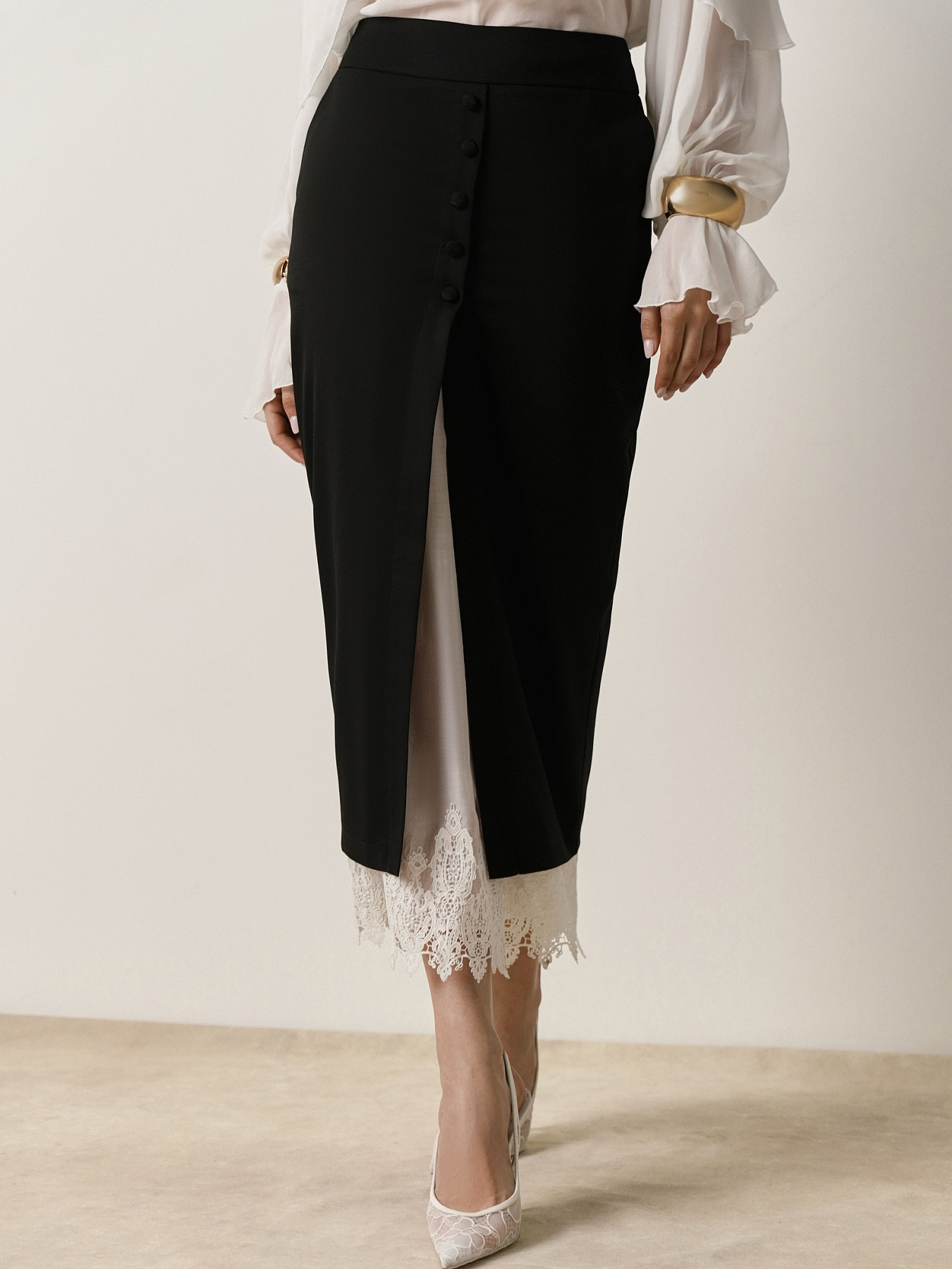 Обе части соединены широким отрезным поясом, образуя единое изделие. Разрез чуть выше колена открывает кружевную отделку нижнего слоя и обеспечивает свободу движения.