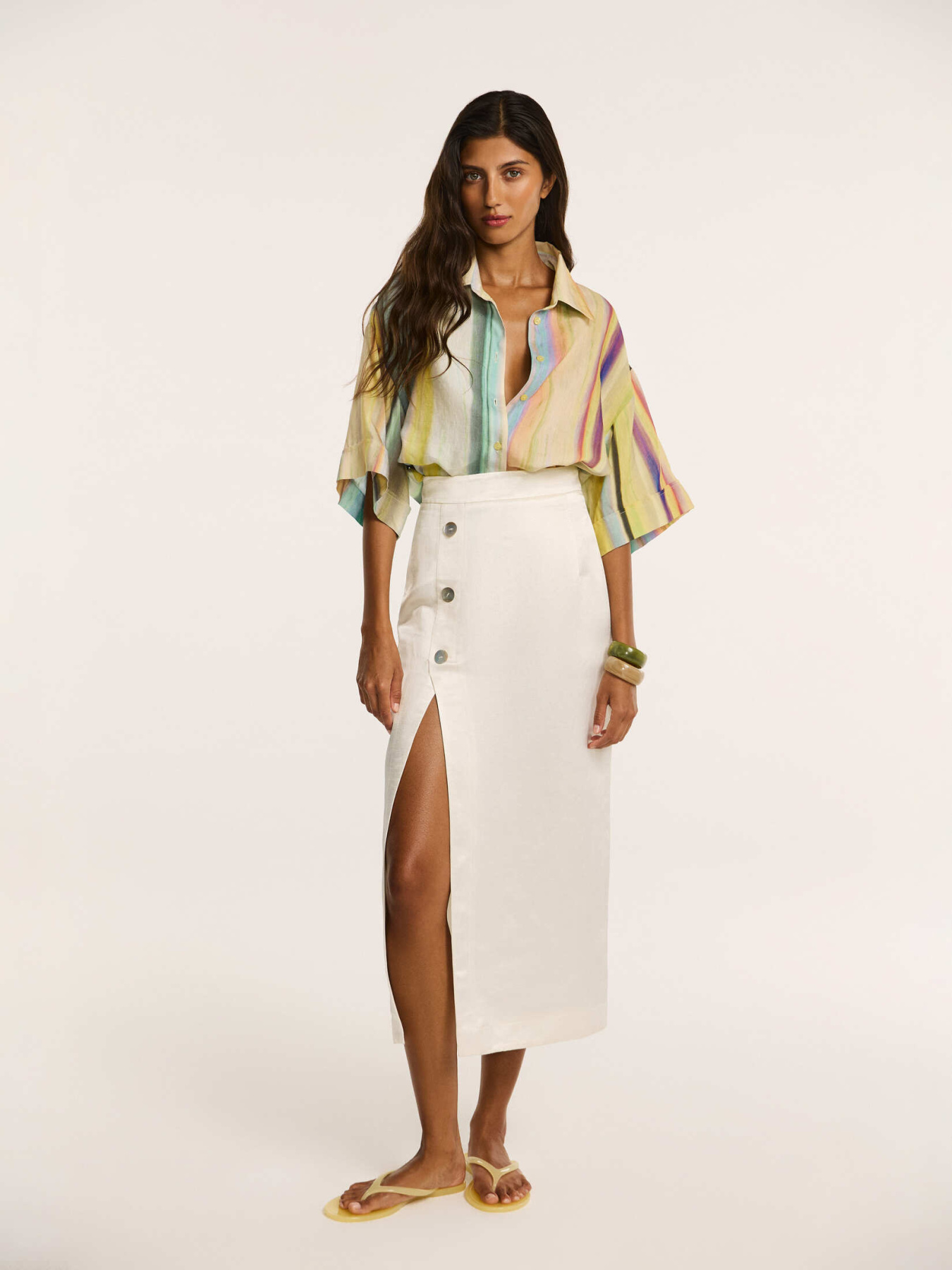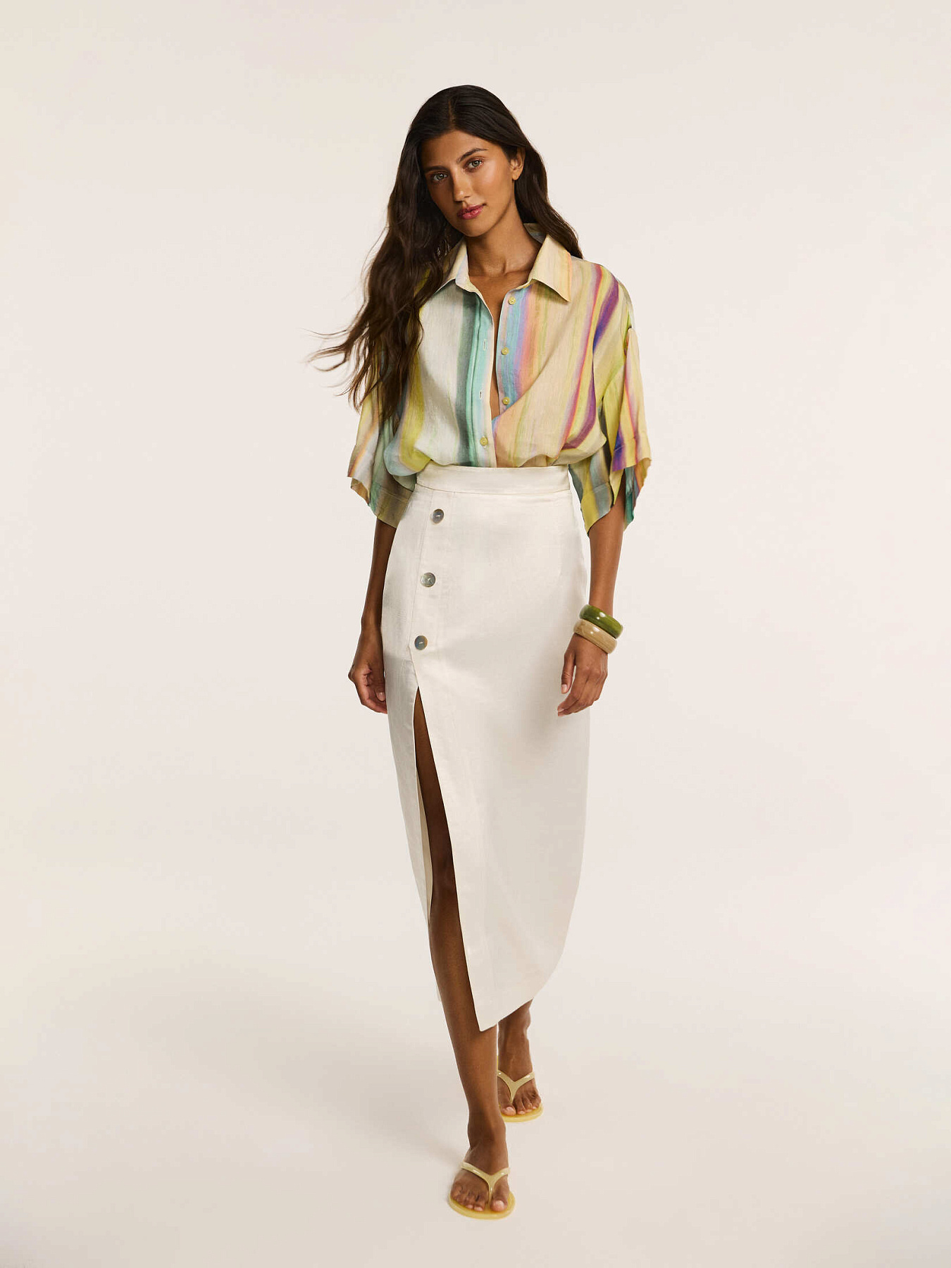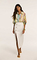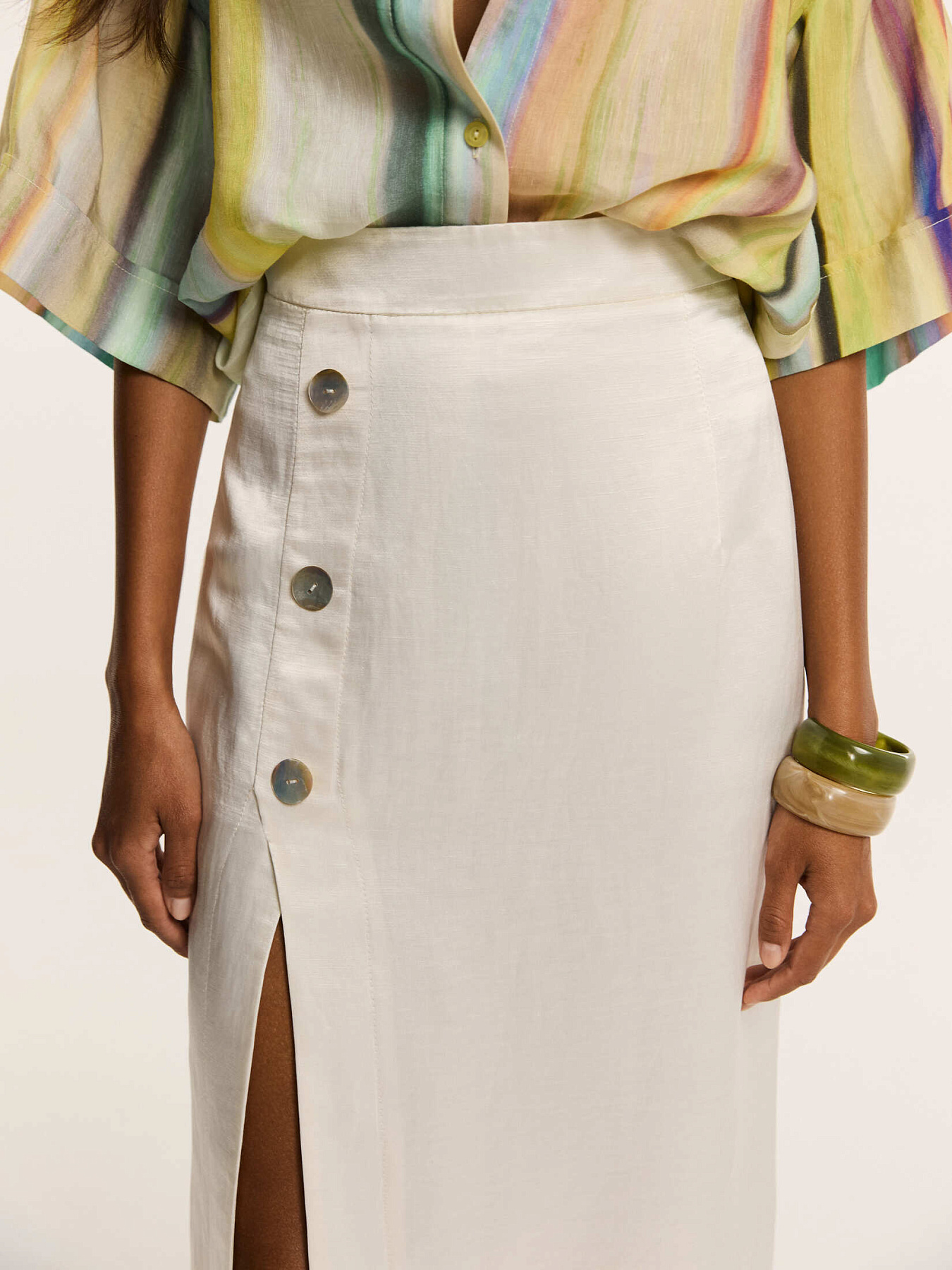 Спереди — имитация запаха с акцентными пуговицами из натуральной ракушки с перламутровым переливом. Этот элемент переходит в разрез, изящно открывающий правую ногу и добавляющий образу динамику.