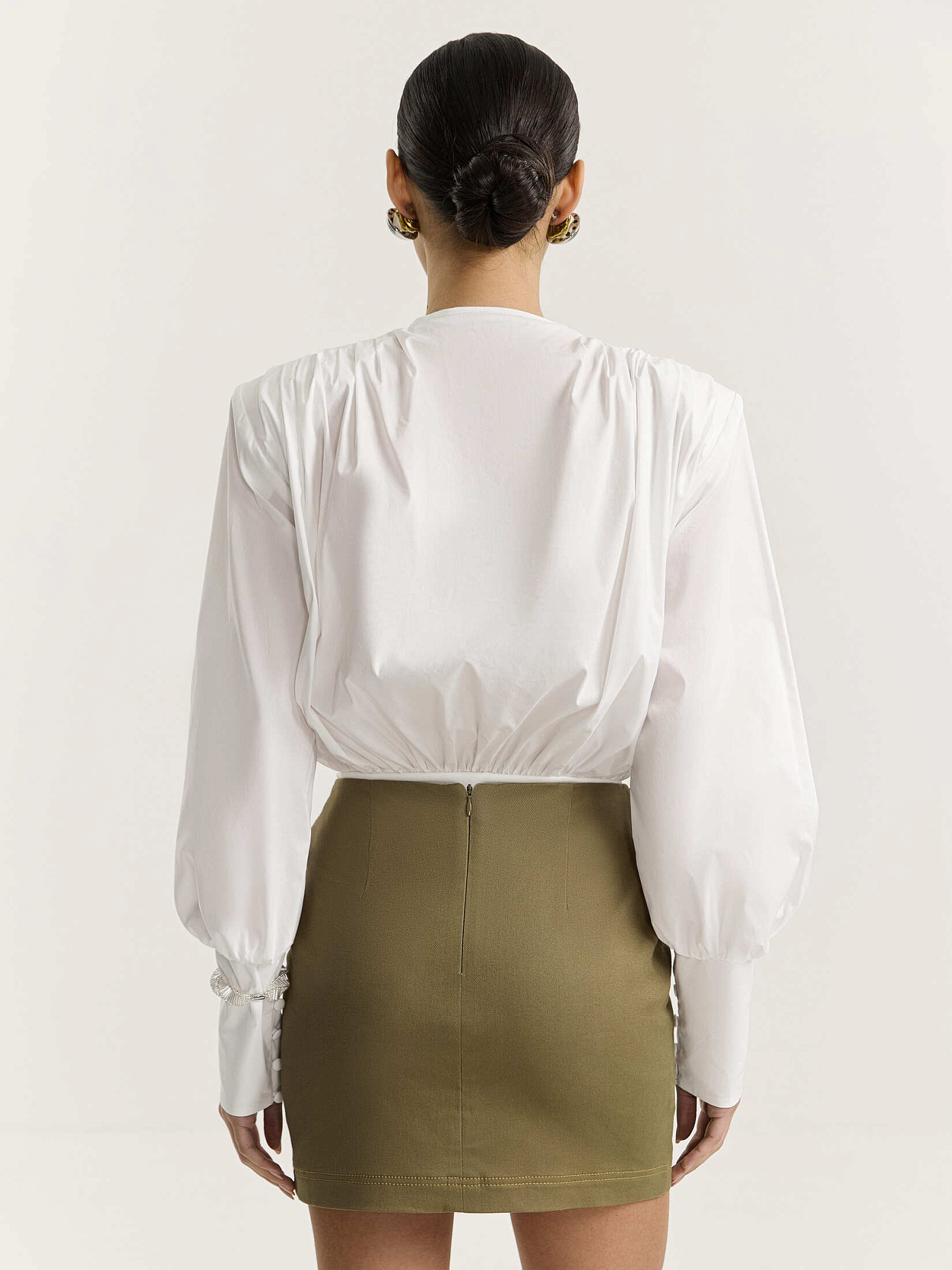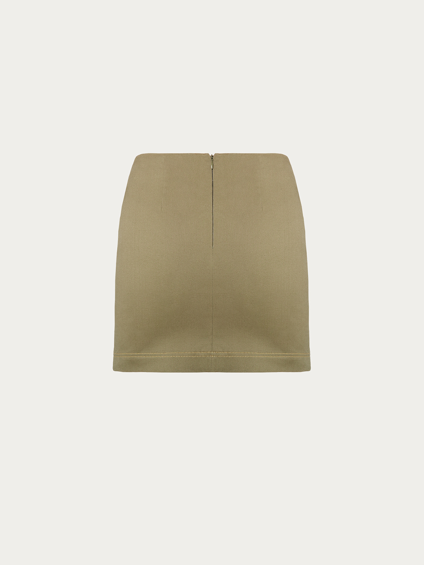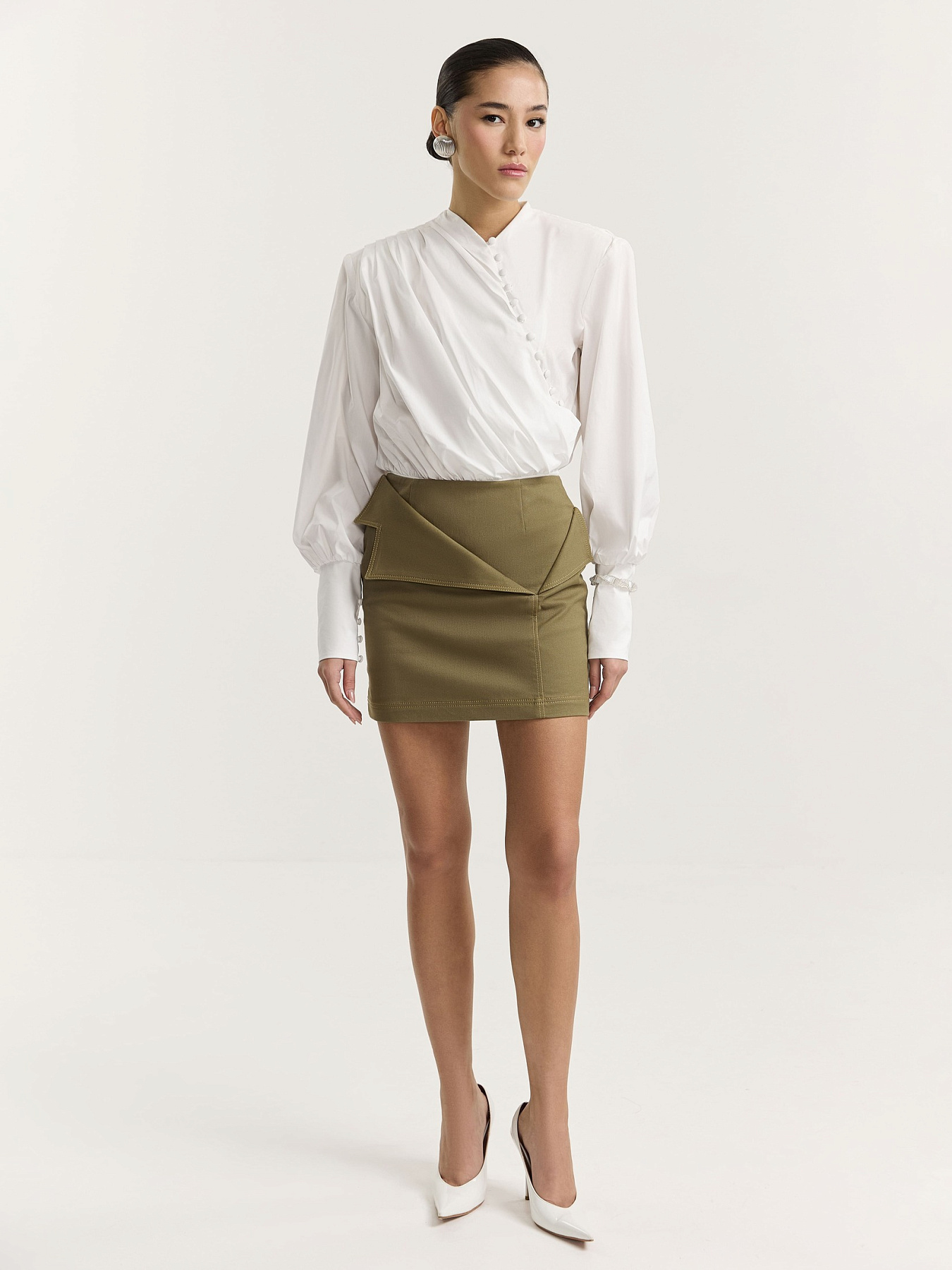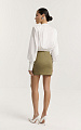Юбка длины мини из итальянского хлопка твилового переплетения, по фактуре напоминающего деним. Четкий силуэт дополнен акцентной накладной деталью по переднему полотнищу, имитирующей английский воротник и создающей графичный, немного архитектурный штрих.