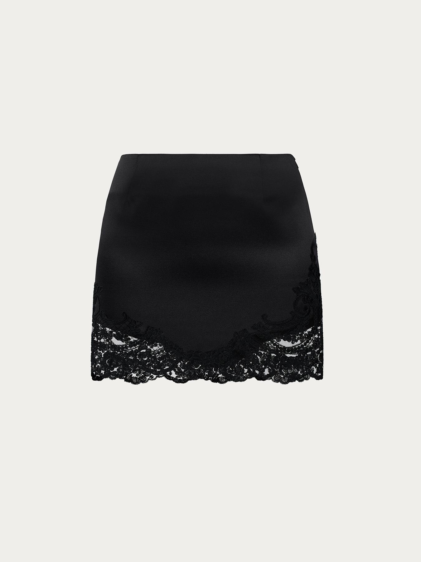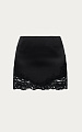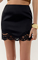 Юбка мини прилегающего силуэта из итальянской ткани дюшес в черном цвете. Средняя посадка подчеркивает линию талии, верхний срез аккуратно закрыт обтачкой.