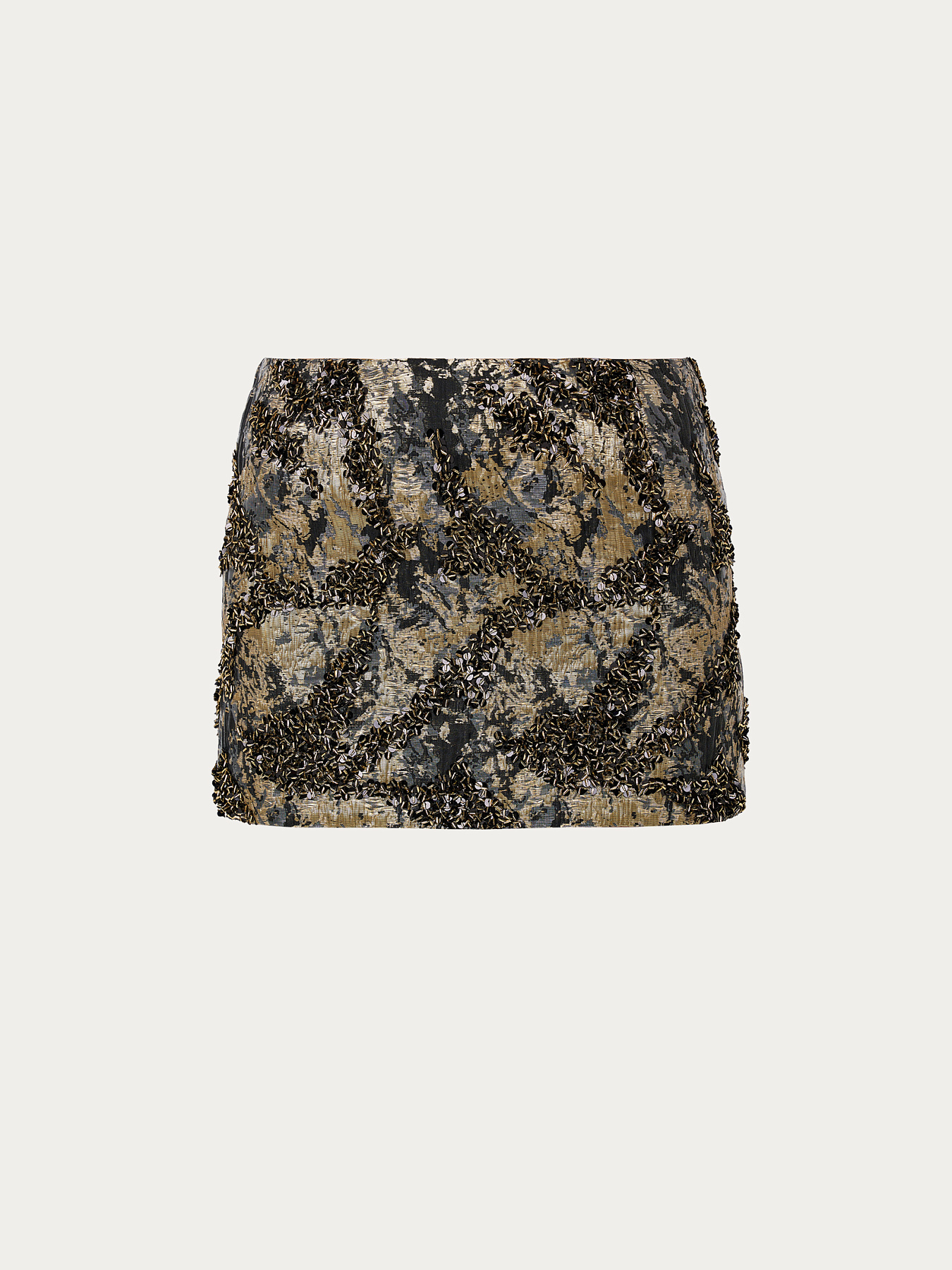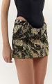 Юбка мини из итальянской ткани с пайетками, выполненная на основе черного жаккарда с золотистой нитью.