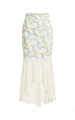 Нижняя часть выполнена из итальянского вискозного шифона в молочном цвете. Лёгкая полупрозрачная ткань словно «подсвечивает» акценты принта, усиливая глубину рисунка и создавая эффект многослойности. Крой полусолнце формирует мягкое расширение к низу: ткань красиво струится и ниспадает плавными складками при движении, а линия соединения двух тканей деликатно оформлена нежным кружевом шантильи — изящный акцент, усиливающий романтичное настроение модели.