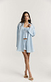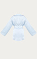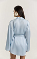 Кимоно из итальянской вискозной кади в нежно-голубом оттенке. Укороченная длина и фигурная линия низа визуально вытягивают силуэт, сохраняя легкость и аккуратность формы. Спущенная линия плеча, широкий рукав и мягкая драпировка ткани создают расслабленное настроение.