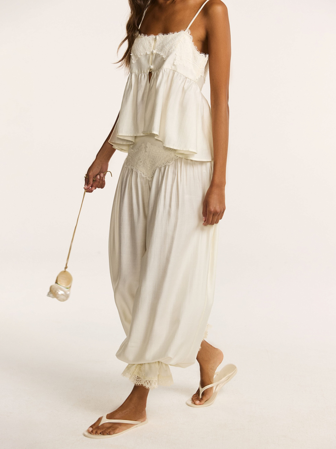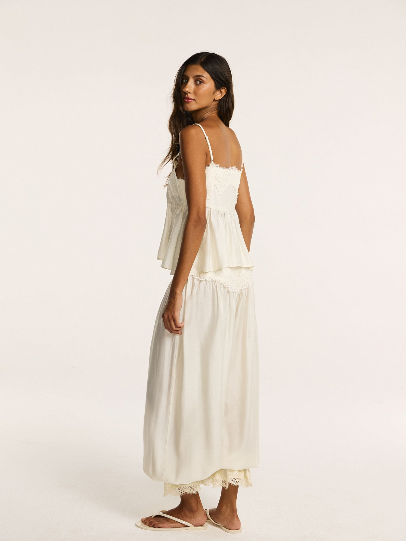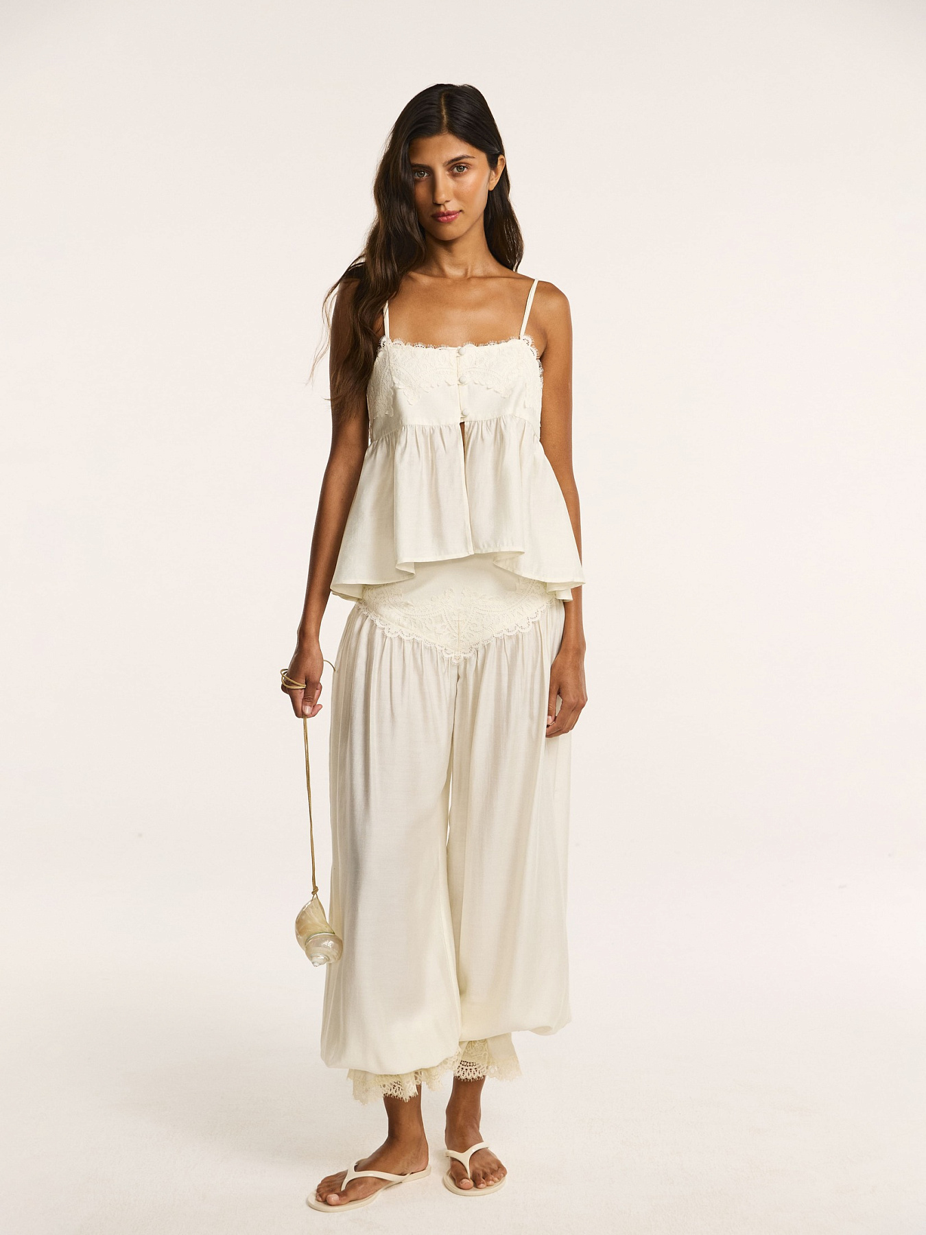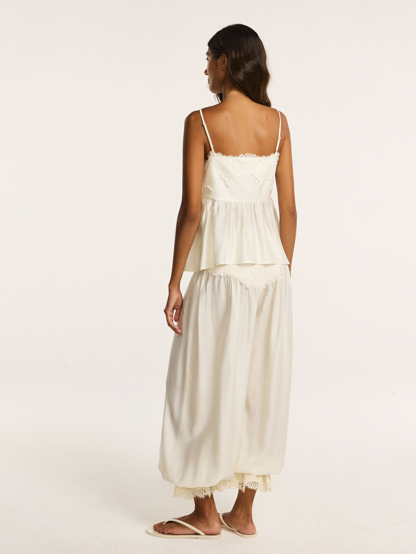 Топ из вискозы в молочном оттенке — утонченная модель, в которой мягкость силуэта сочетается с тонкой ручной работой и деликатной декоративностью.