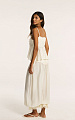 Нижняя часть собрана в мягкую сборку с деликатным расширением к низу, формируя воздушный, женственный объём. Фигурный нижний срез с удлиненными боковыми линиями придает пластичность.