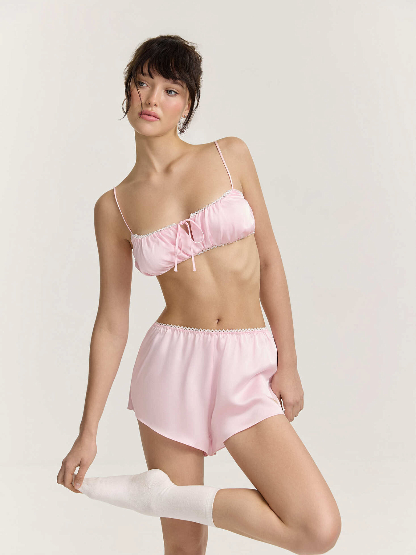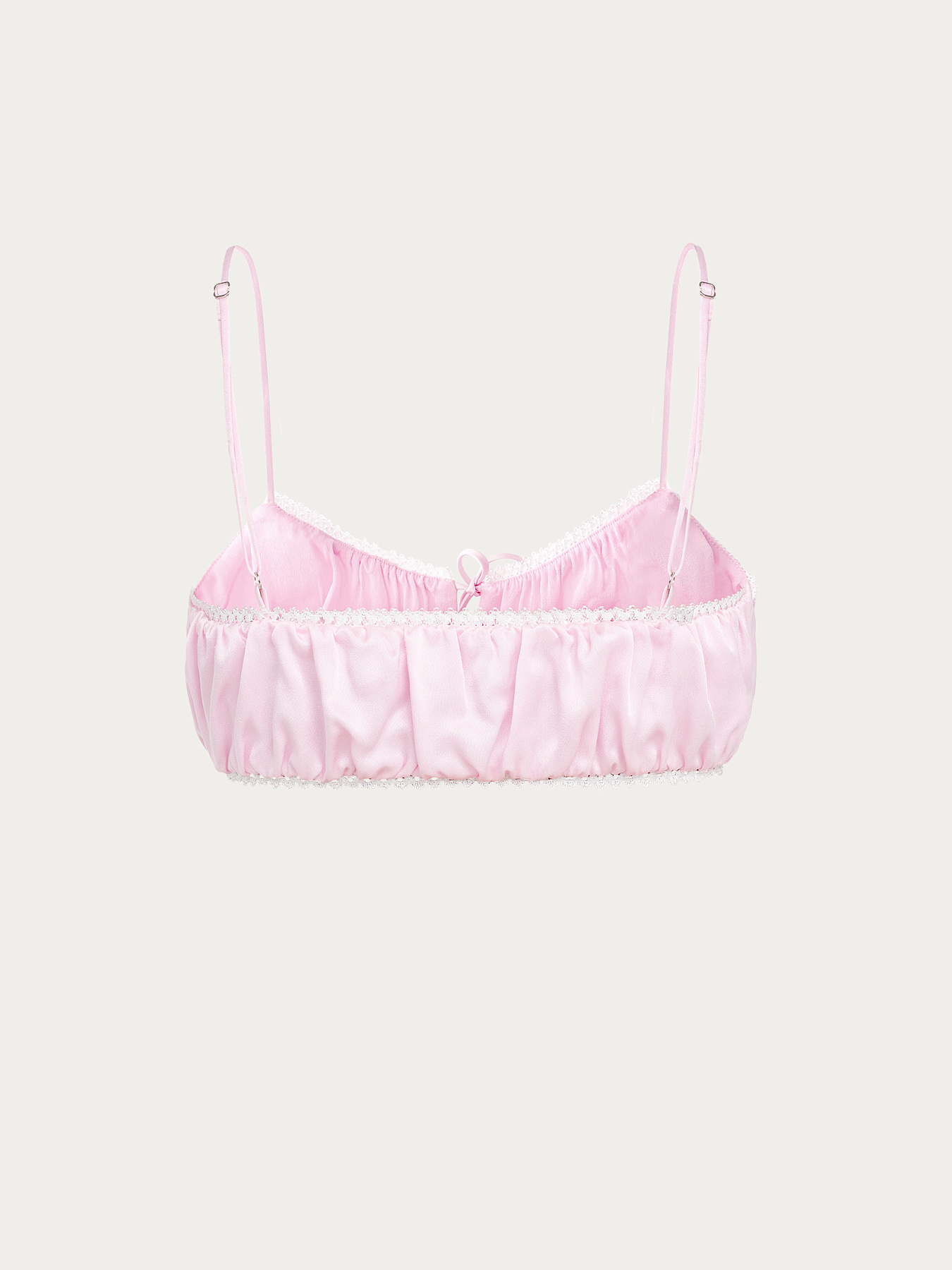 Бельевой топ из итальянской вискозной кади в нежно-розовом оттенке. Отрезной двойной лиф собран на бельевую резинку с кружевным краем в контрастном белом цвете — благодаря этому появляются мягкие вертикальные складки и аккуратная посадка.