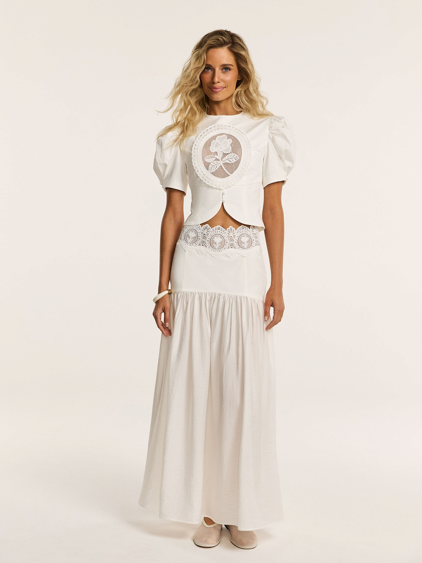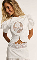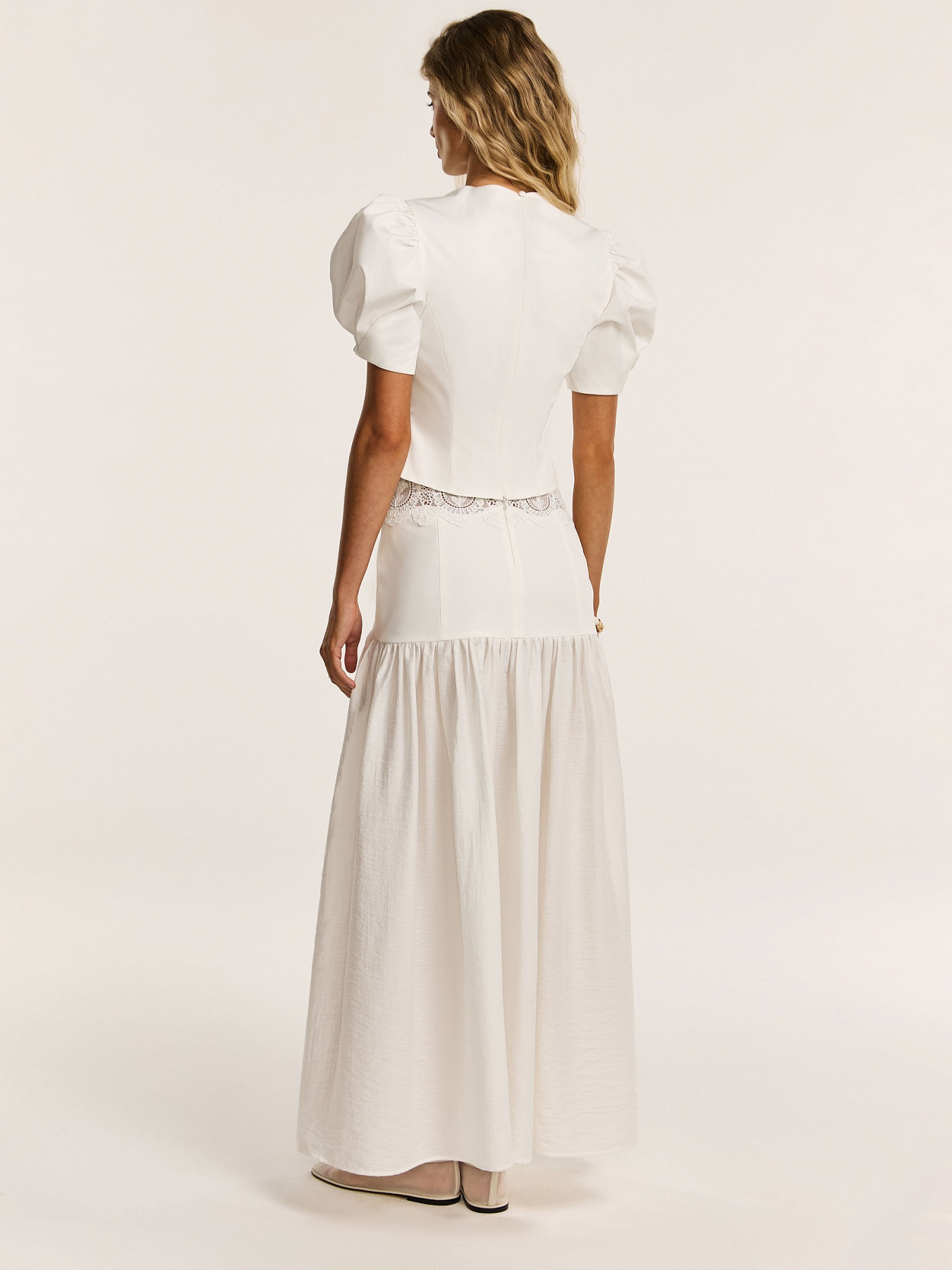Топ из итальянского хлопка в молочном оттенке — модель с выразительным силуэтом и тонко выстроенной кружевной деталью.
