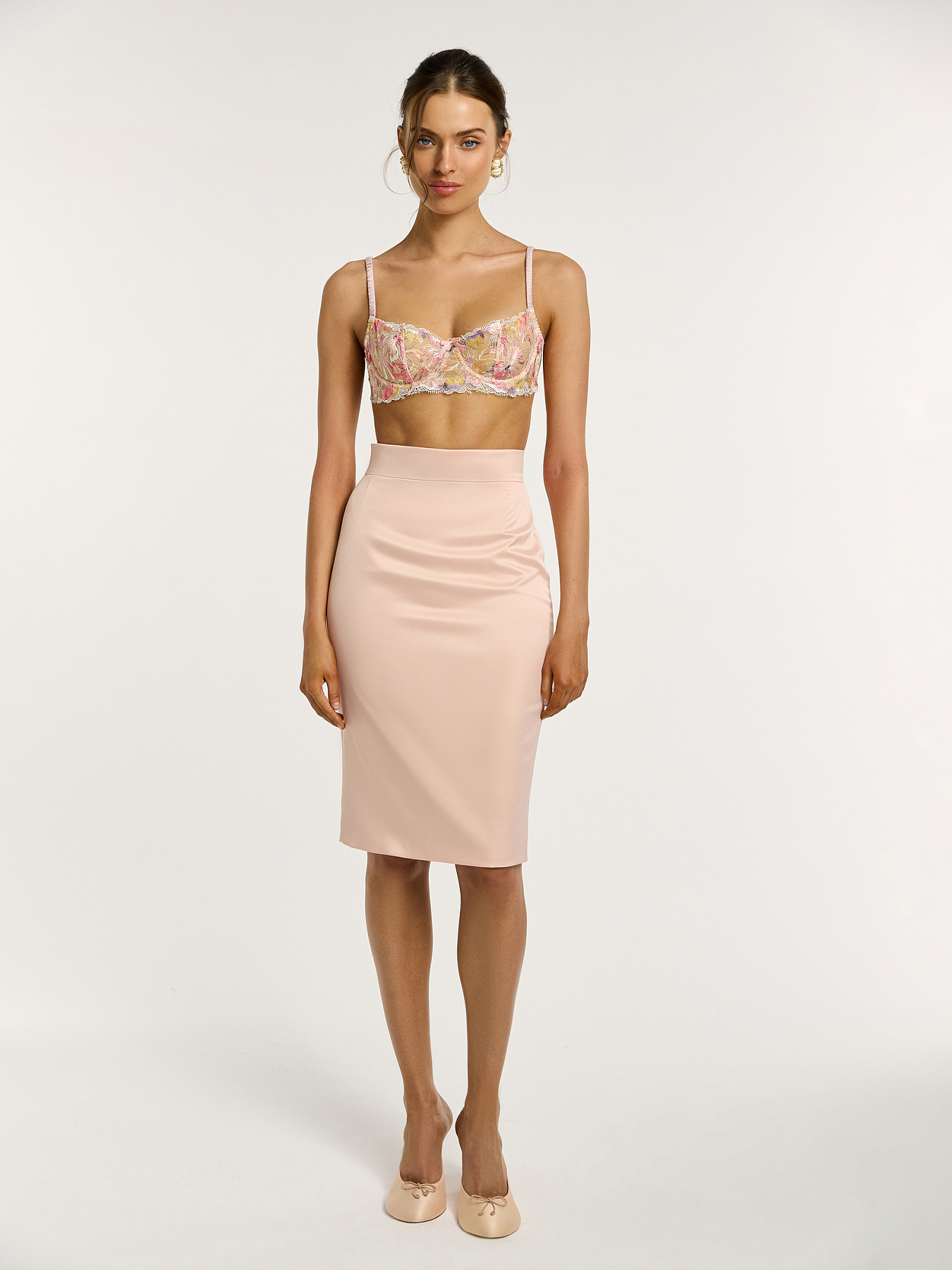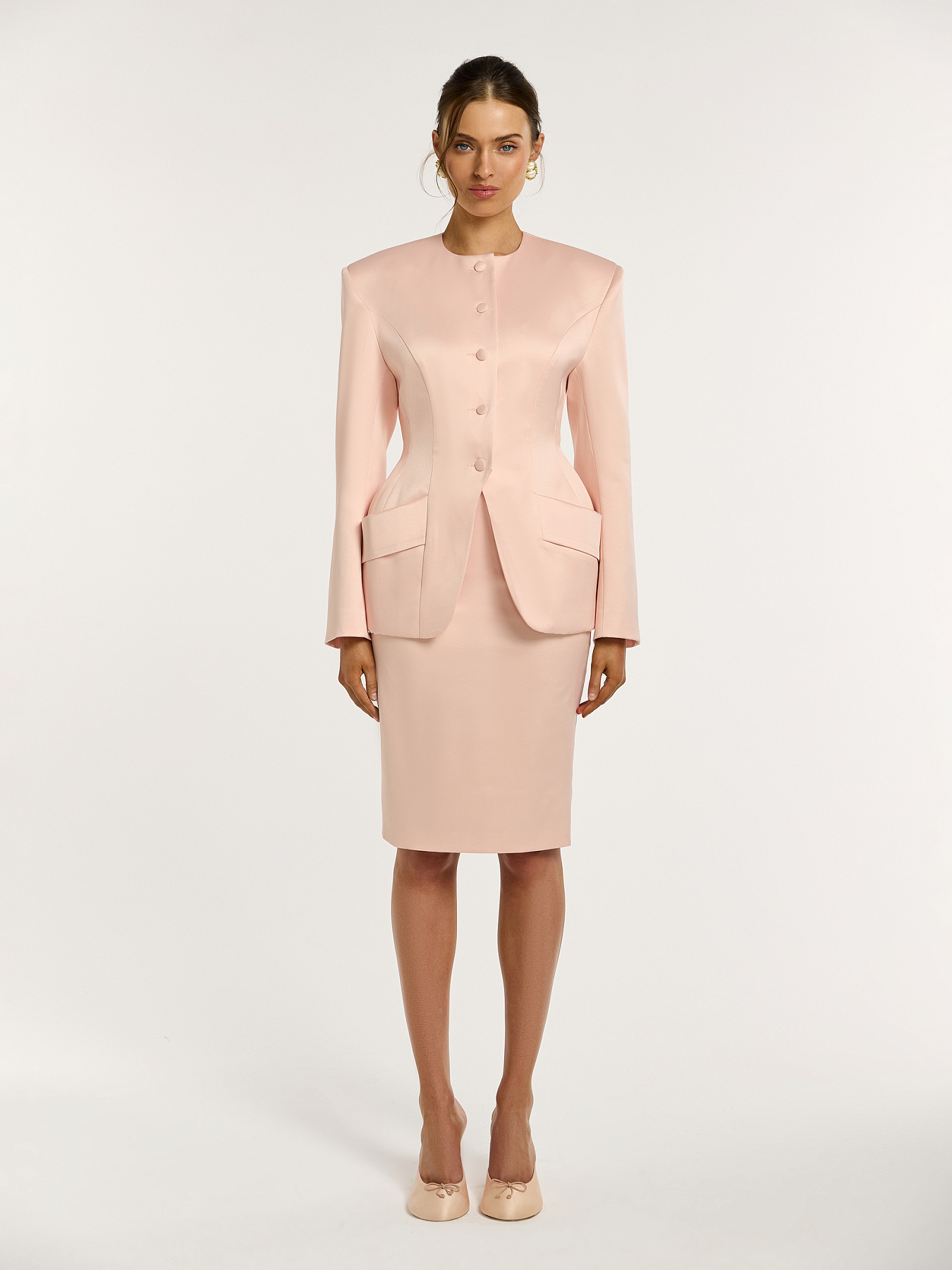 Юбка-карандаш прилегающего силуэта в утонченном пудровом оттенке — воплощение сдержанной женственности и выверенной лаконичности.