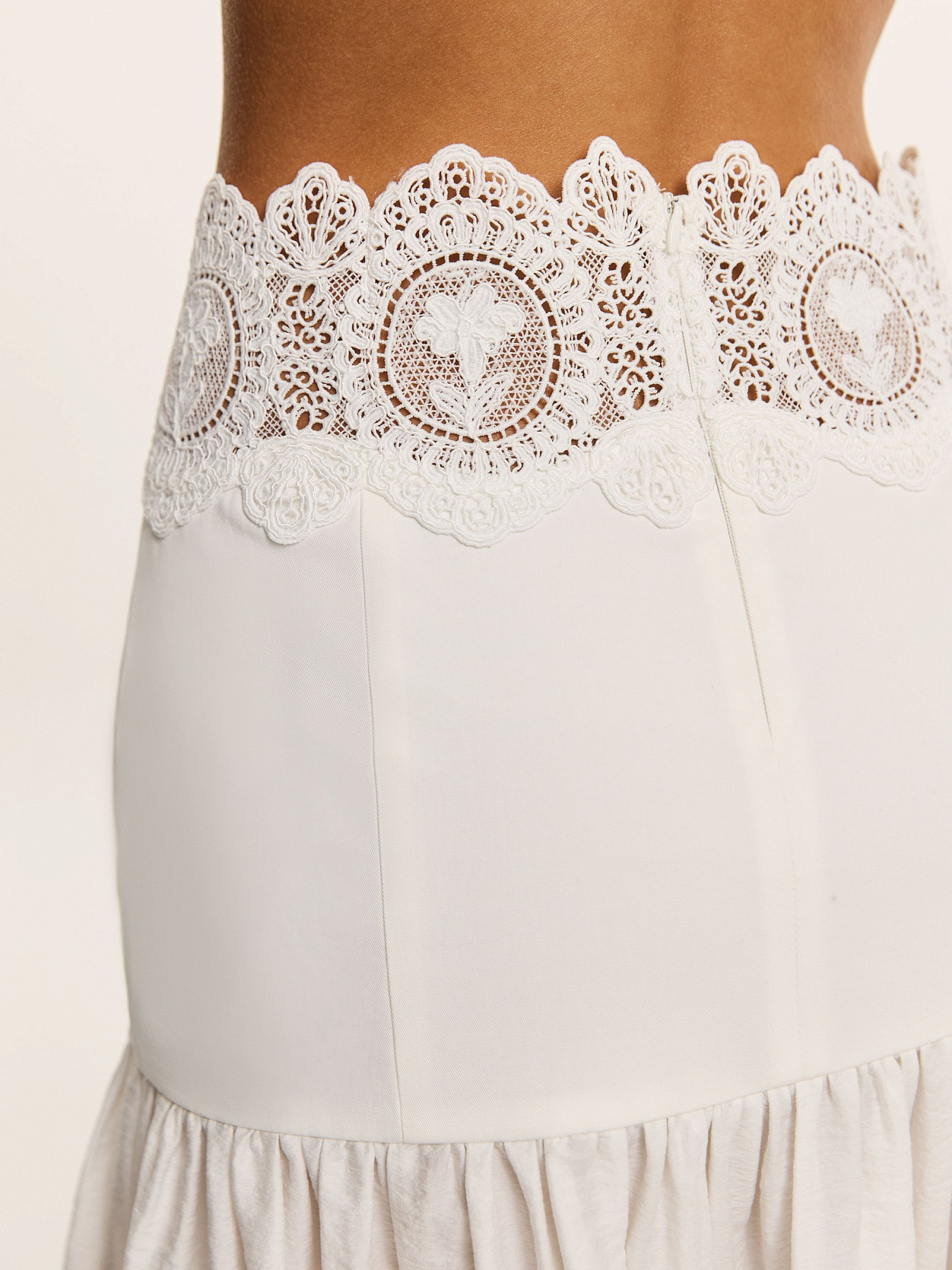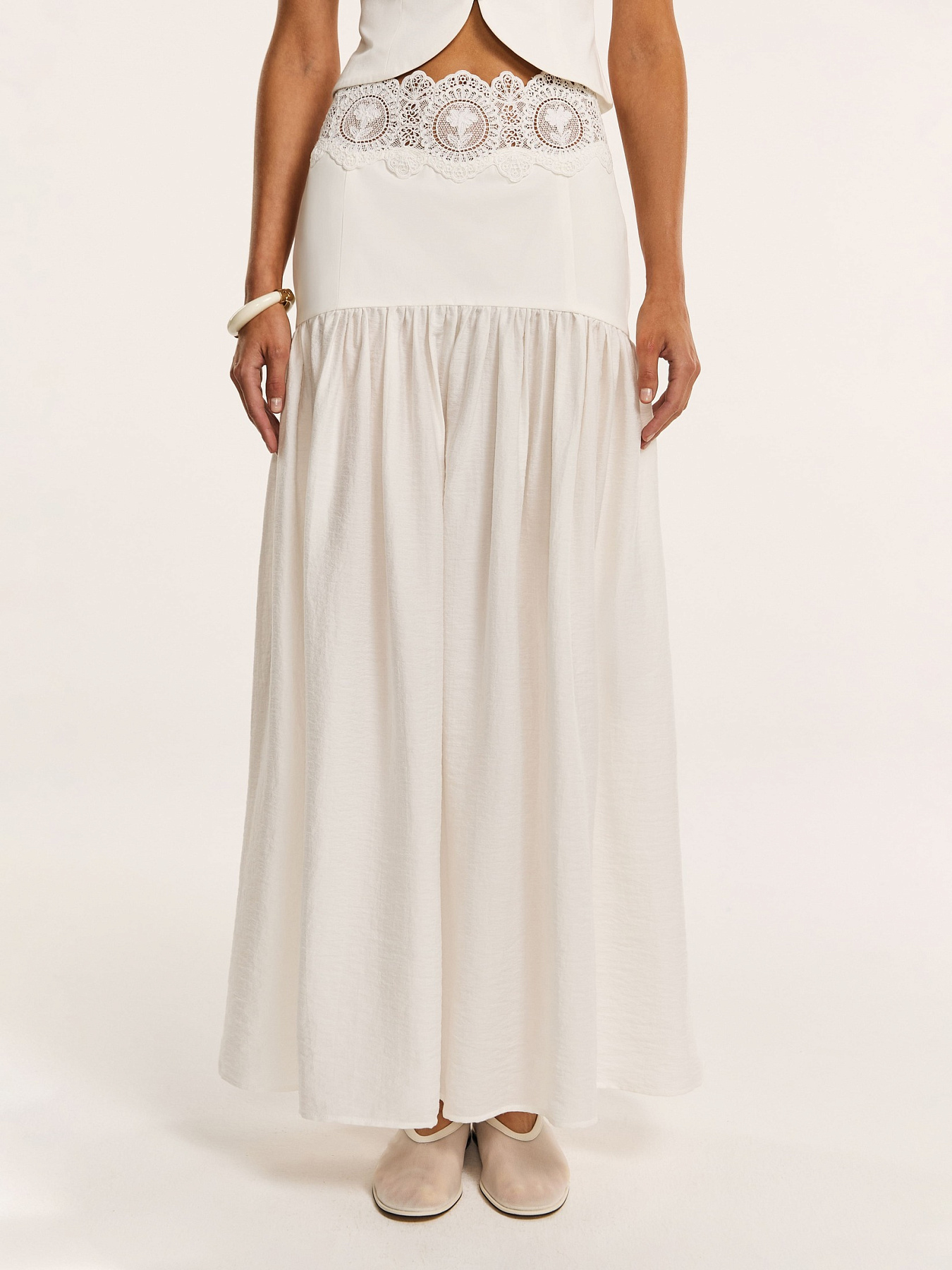 Юбка макси А-силуэта в молочном оттенке — утонченная модель, в которой архитектурная четкость сочетается с воздушностью фактуры и тонкой декоративной работой.