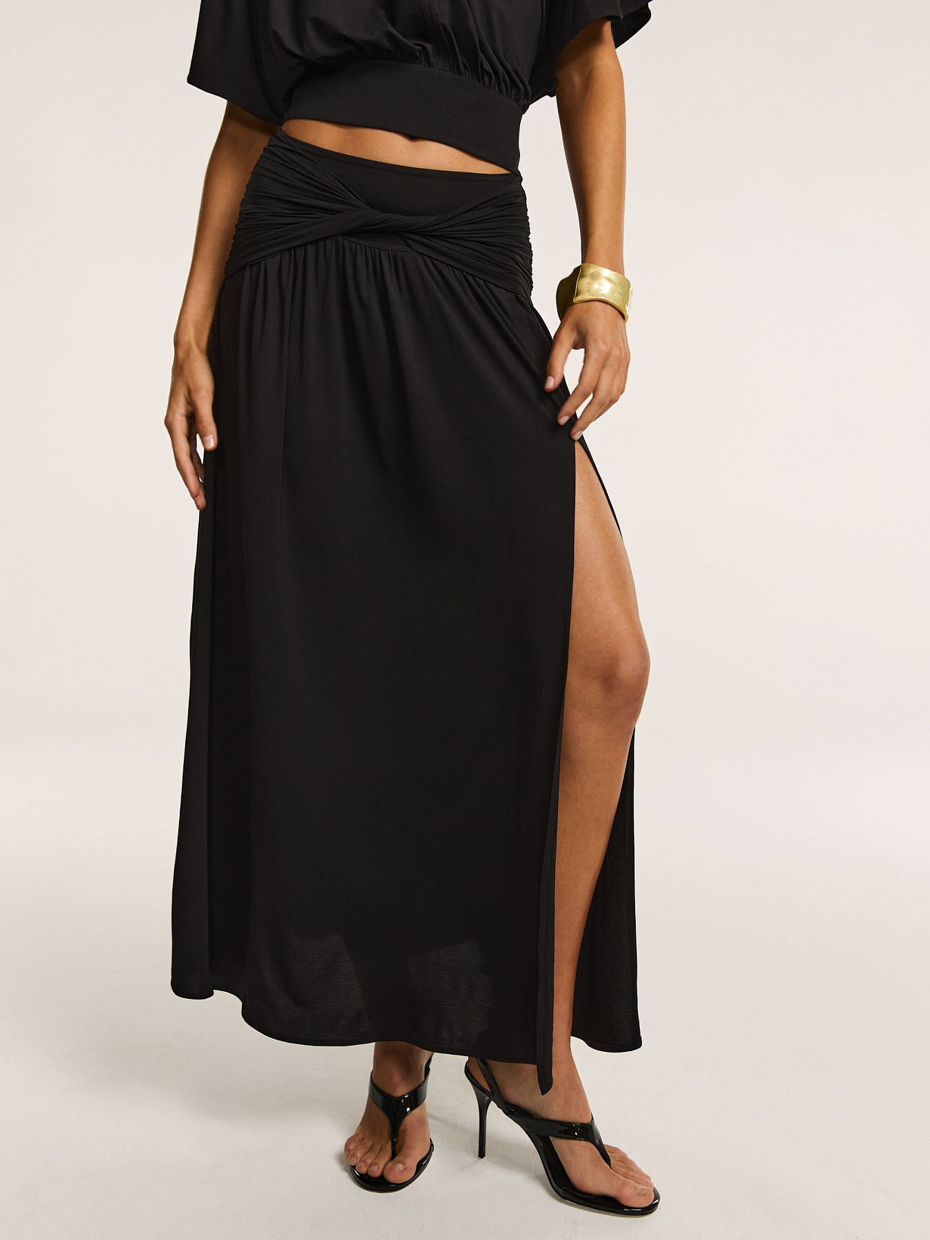 Юбка макси из итальянского вискозного трикотажа в черном оттенке — элегантная модель, в которой мягкая пластика ткани сочетается с утонченной драпировкой и благородным сиянием.