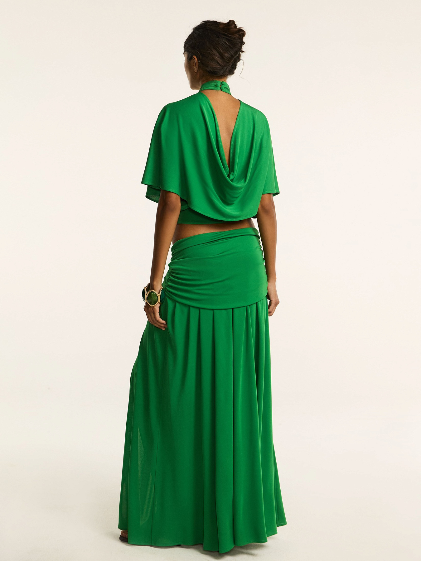 Юбка макси из итальянского холодного вискозного трикотажа в зеленом оттенке — элегантная модель, в которой мягкая пластика ткани сочетается с утонченной драпировкой и благородным сиянием.