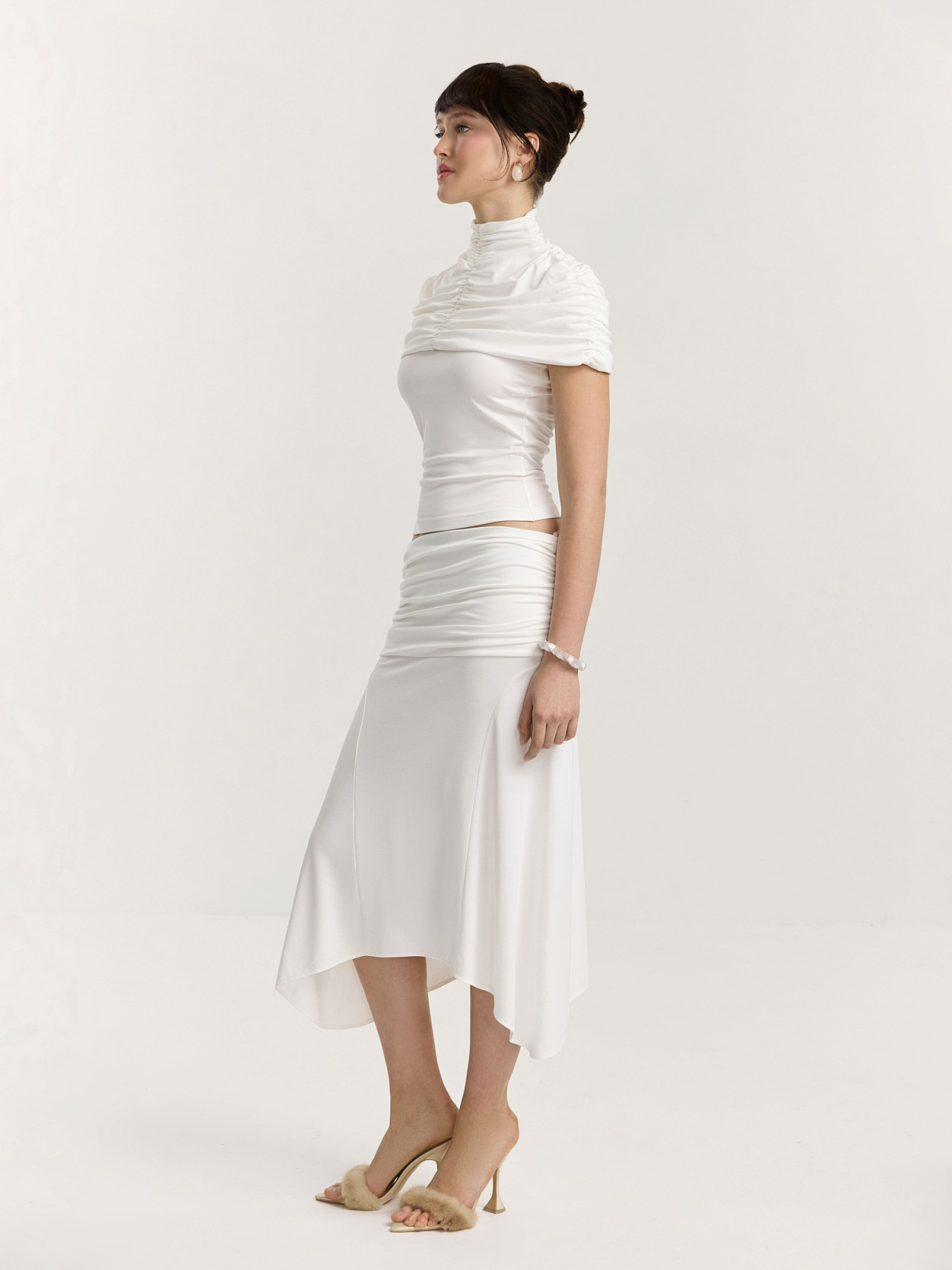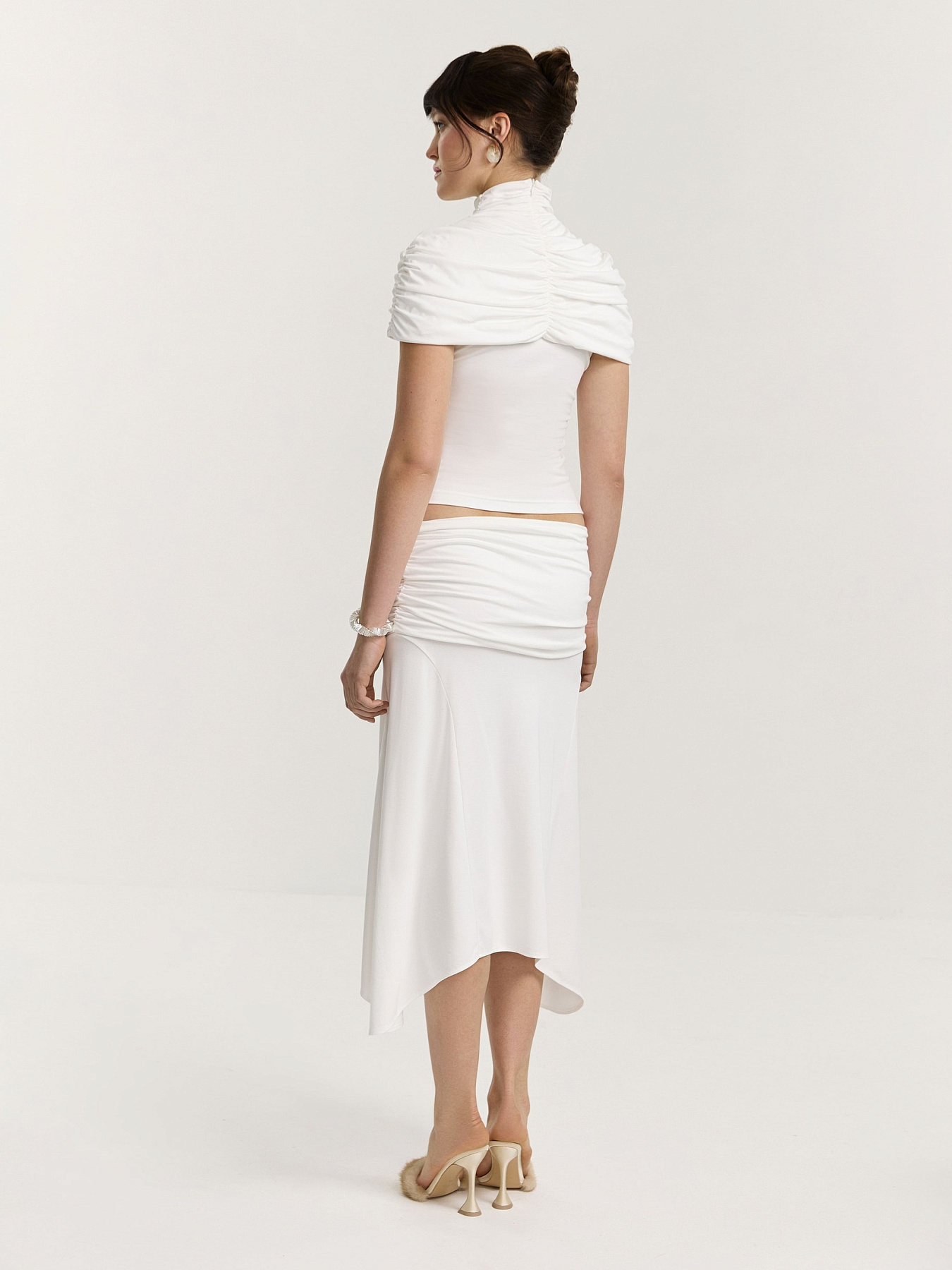 Юбка из итальянского вискозного трикотажа в молочном оттенке. Длина до колена и силуэт трапеция создают легкую, плавную линию, которая красиво раскрывается в движении.