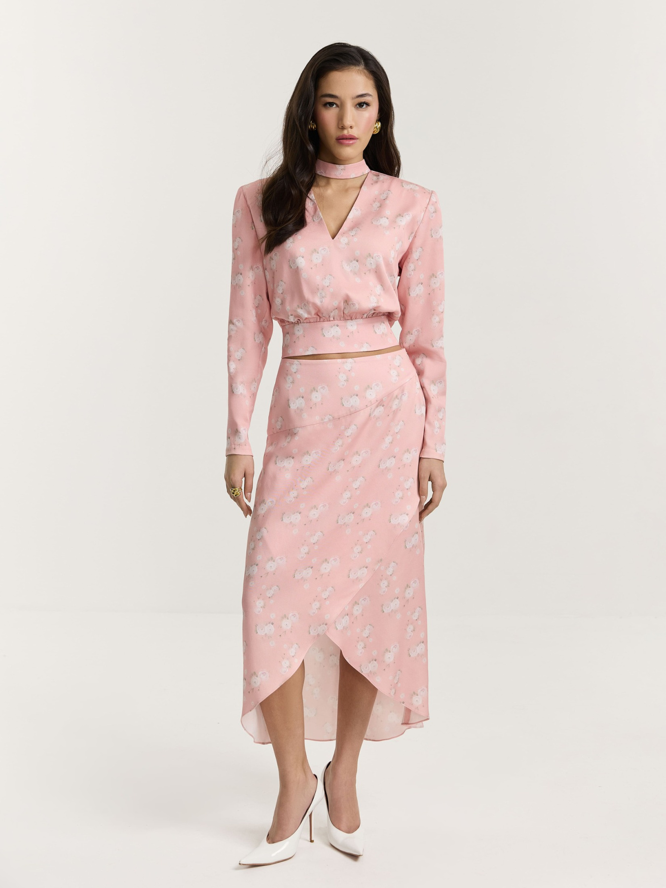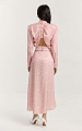 Юбка из принтованной вискозы в нежно-розовом оттенке. На фоне — молочные ранункулюсы, хаотично рассыпанные по полотну. Принт создан специально для этой коллекции нашим графическим дизайнером.