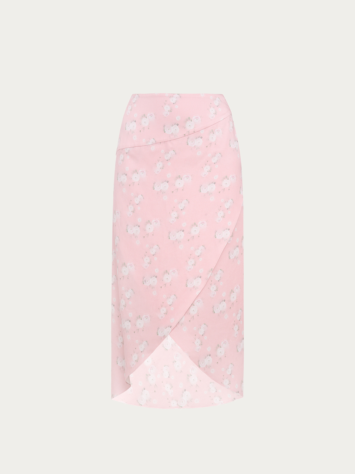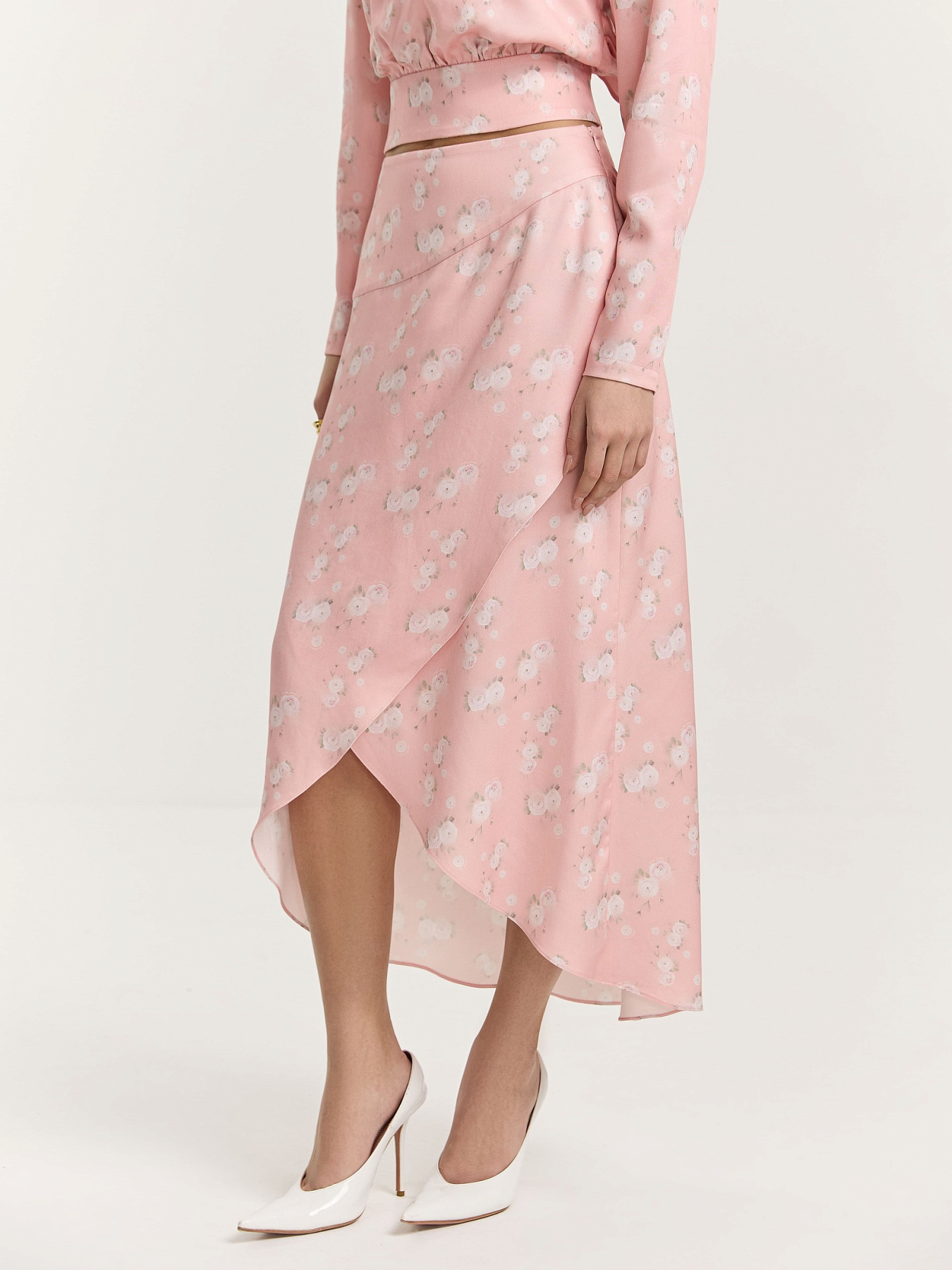 Юбка из принтованной вискозы в нежно-розовом оттенке. На фоне — молочные ранункулюсы, хаотично рассыпанные по полотну. Принт создан специально для этой коллекции нашим графическим дизайнером.