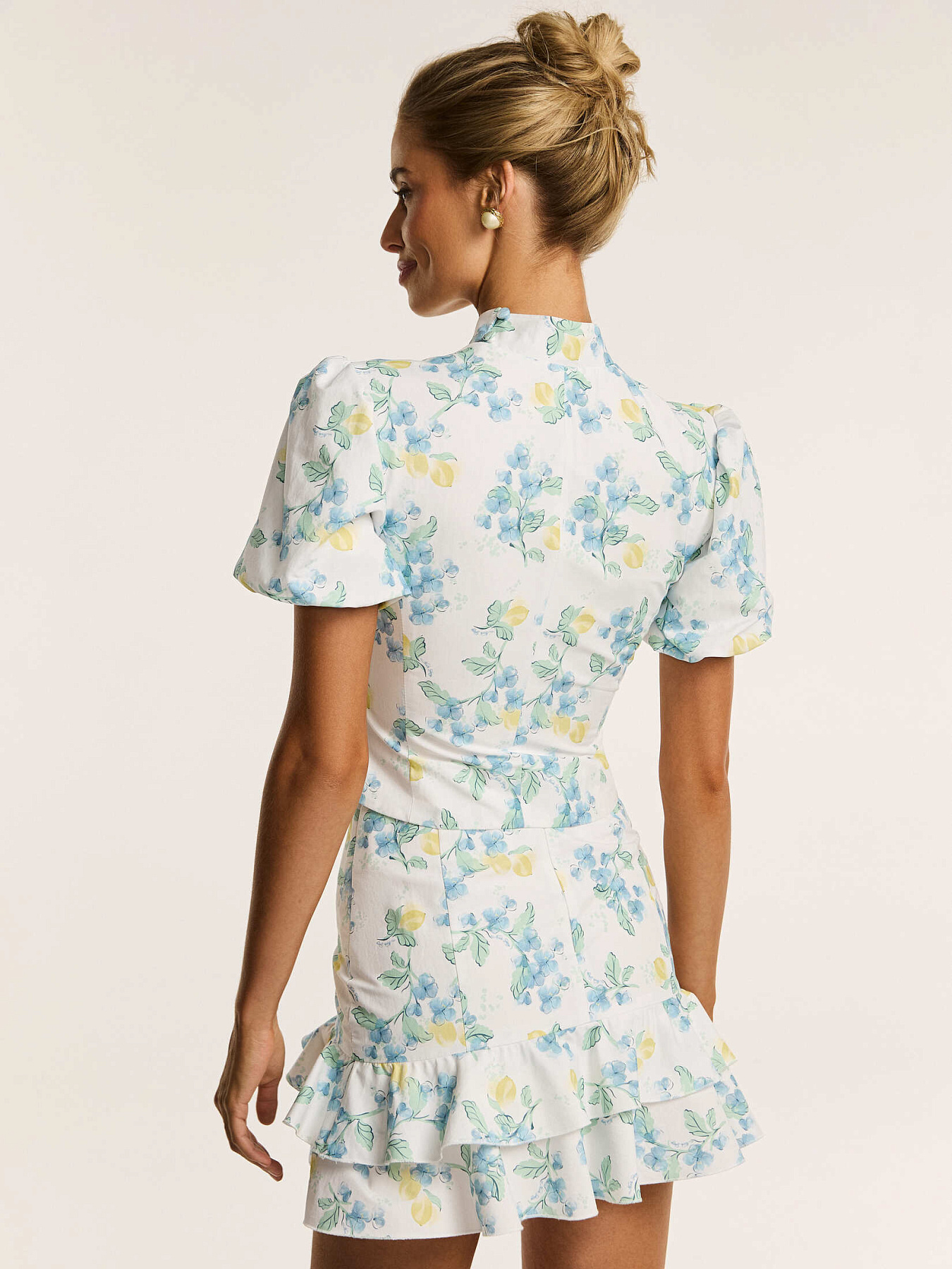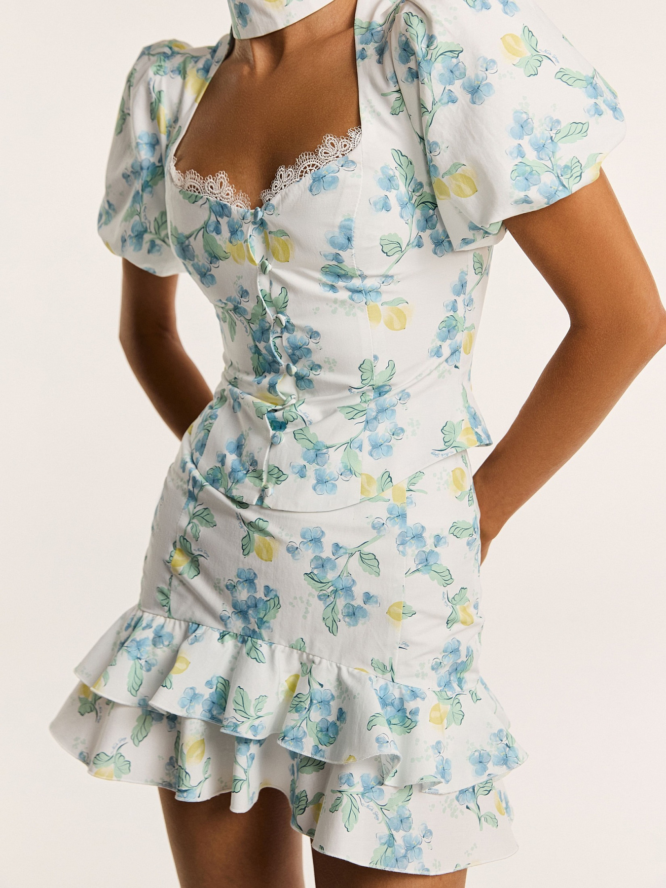 Авторский принт с цветками голубого жасмина и лимонами создан специально для этой коллекции нашим дизайнером и напечатан на фабрике в Италии.