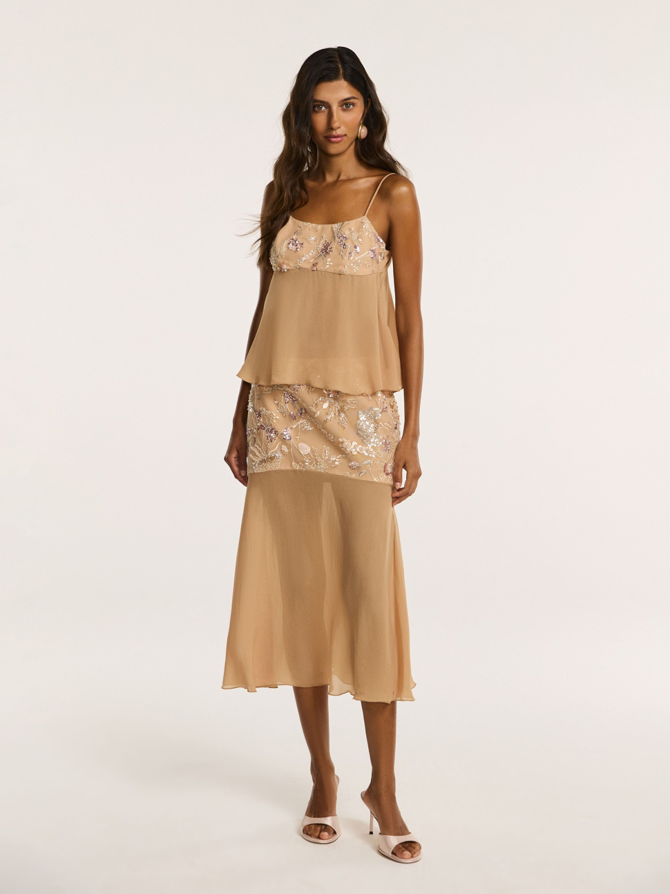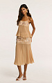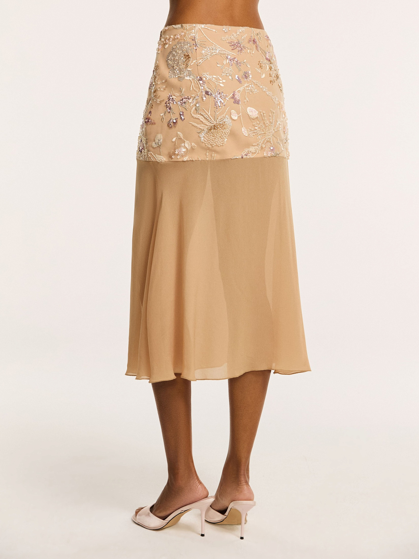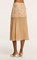 Юбка средней длины в бежевом оттенке — модель с акцентом на ручную вышивку и лёгкость силуэта.
