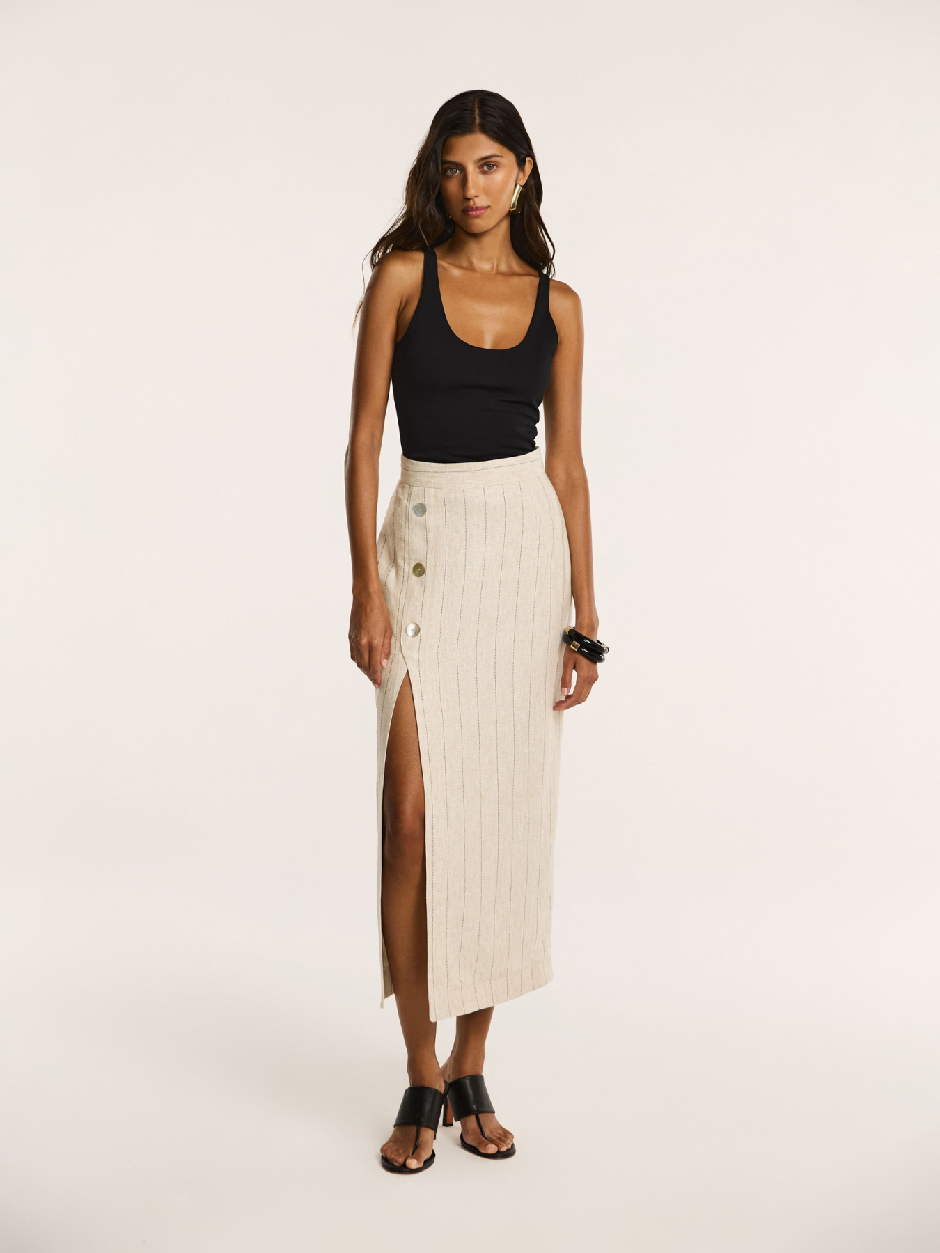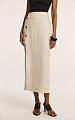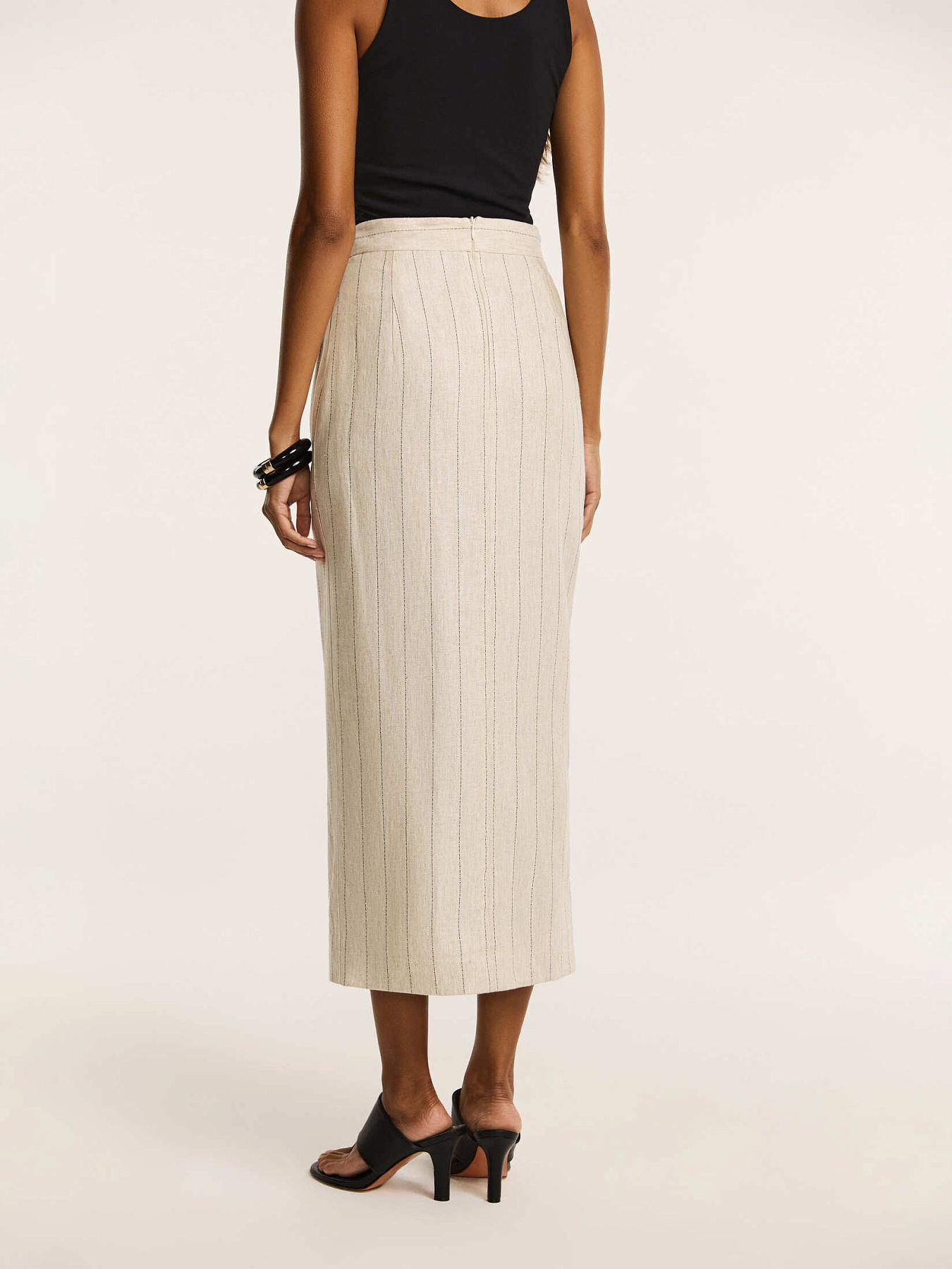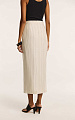 Юбка-карандаш прилегающего силуэта длины миди в благородном бежевом оттенке в полоску — утонченная модель с акцентом на чистоту линий и безупречную посадку.