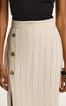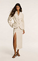 Спереди — имитация запаха с акцентными пуговицами из натуральной ракушки с деликатным перламутровым переливом. Этот элемент переходит в разрез, изящно открывающий правую ногу и добавляющий образу динамику.
